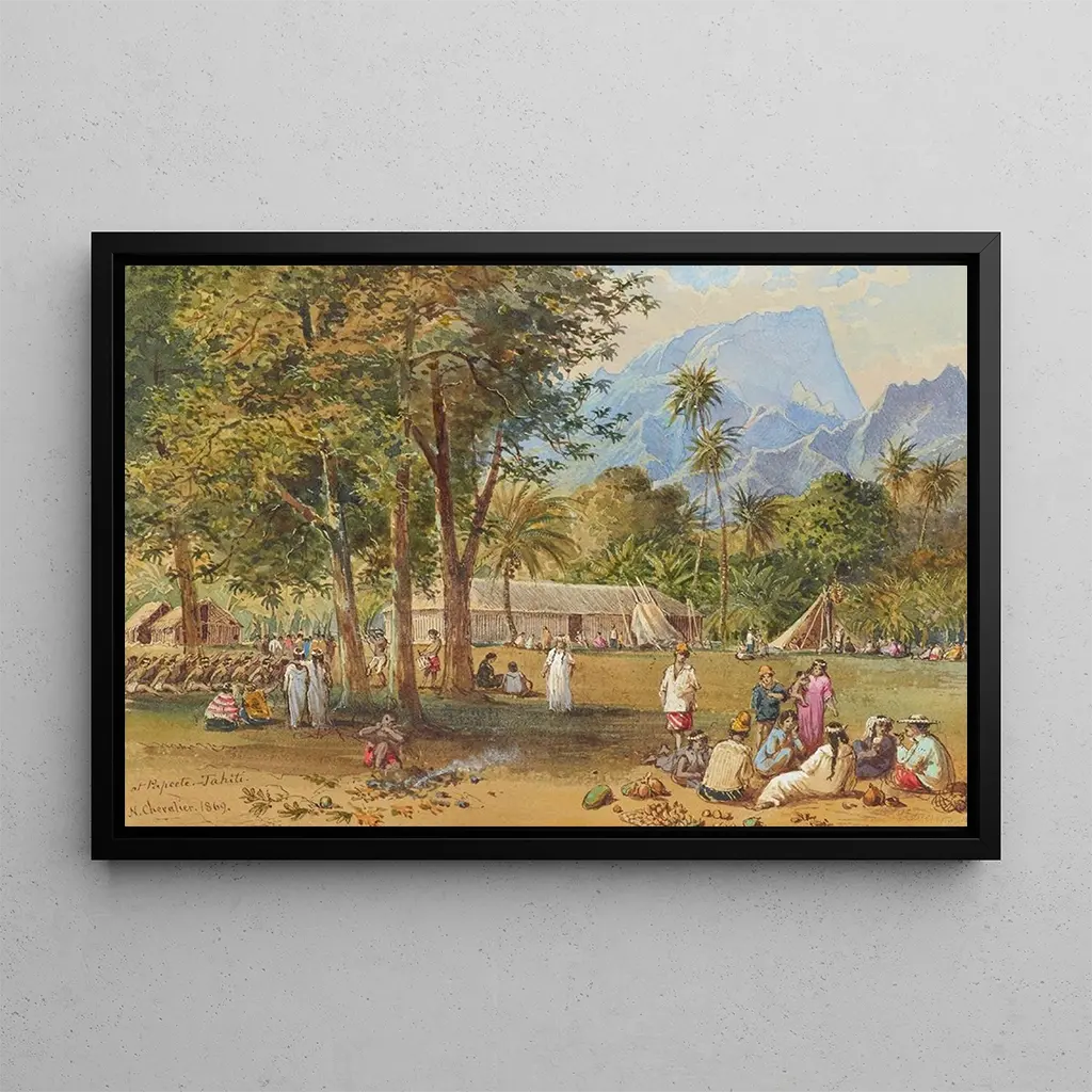 På Papeete, Tahiti: en resa till tropikernas hjärta. Nicholas Chevalier ger oss med "På Papeete, Tahiti" ett öppet fönster mot de förtrollande landskapen på ön. Kanvasen skildrar livfulla scener i färg, där havets blå nyanser blandas med den frodiga gröna vegetationen. Detaljerna av palmer och traditionella bostäder framkallar en atmosfär av lugn och exotism. Chevalier, genom sin impressionistiska teknik, lyckas fånga ljuset och den unika stämningen i detta ställe, och förflyttar betraktaren till avlägsna, soliga kuster. Nicholas Chevalier: en resande konstnär med landskapet i hjärtat. Född 1828, Nicholas Chevalier är en nyzeeländsk konstnär som har rest världen runt och lämnat ett outplånligt avtryck i landskapskonsten. Hans vistelse på Tahiti under 1860-talet markerar en vändpunkt i hans karriär, vilket ger honom möjlighet att utforska teman som exotism och natur. Påverkad av den romantiska rörelsen använder Chevalier livfulla färger och dynamiska kompositioner för att uttrycka skönheten i de platser han besöker. Hans arbete är en hyllning till naturens landskap, och han spelar en nyckelroll i den konstnärliga framställningen av Stillahavsöarna. En dekorativ konsttryck med många fördelar. Konsttrycket av "På Papeete, Tahiti" är ett perfekt tillskott till all inredning, oavsett om det är ett vardagsrum, ett kontor eller ett sovrum. Dess utskriftskvalitet garanterar en exceptionell trohet mot de livfulla färgerna och detaljerna i originalverket, och tillför en touch av exotism och värme till ditt utrymme. Detta konsttryck väcker minnen av resor och flykt, och skapar en välkomnande och inspirerande atmosfär. Genom att välja detta konsttryck ger du din inredning ett konstverk som kan förföra och förundra dina gäster.