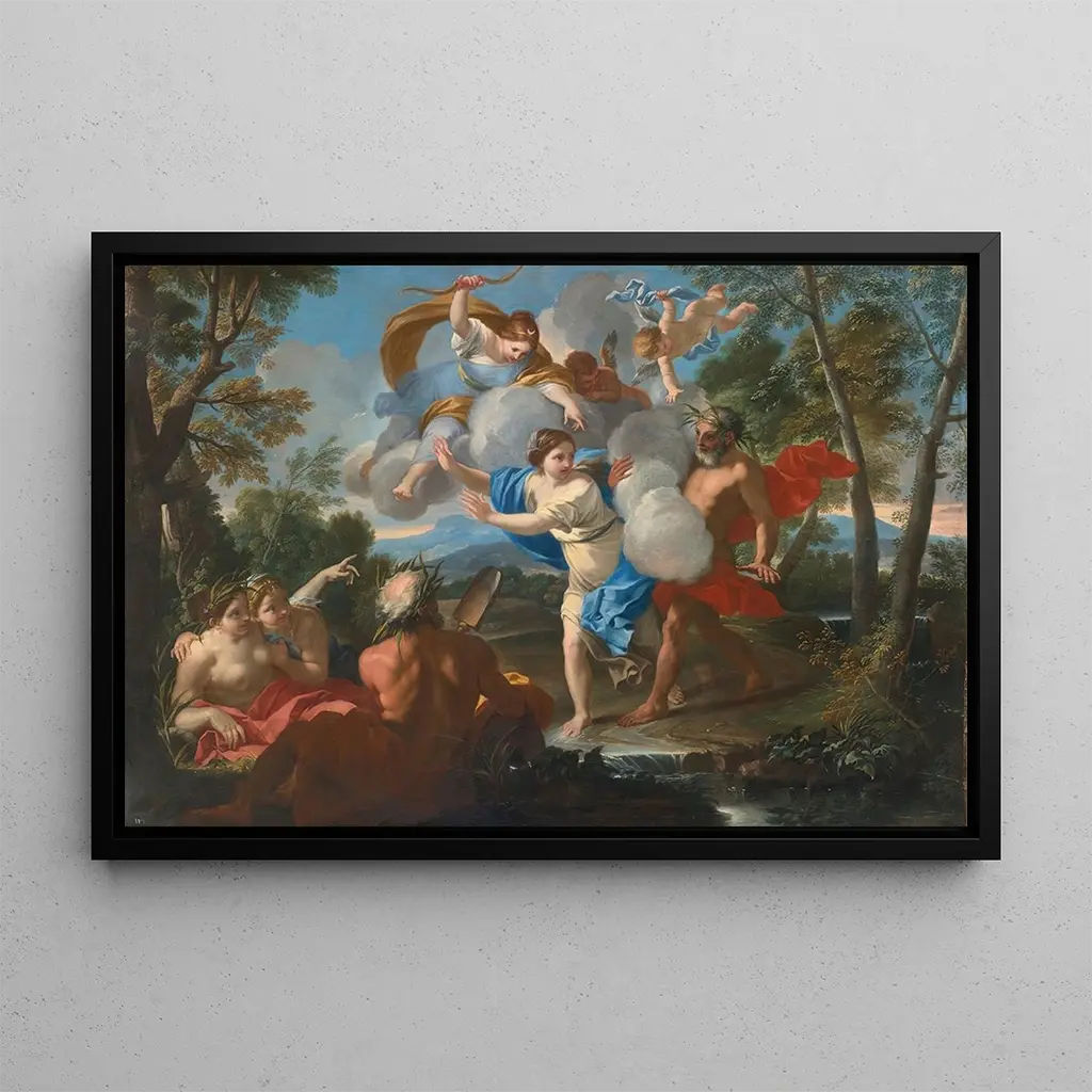 Konsttrycket av målningen "Alphée och Aréthuse" av Luigi Garzi illustrerar en mytologisk scen fylld av passion och mystik. Denna konstnärliga skapelse, rik på färger och detaljer, skildrar mötet mellan floden Alphée och nymfen Aréthuse, som symboliserar kärlek och odödlighetens sökande. De livfulla nyanserna och ljusspel skapar en förtrollande atmosfär, medan Garzis teknik, som blandar barock och klassicism, ger liv åt denna antika legend. Varje karaktär är noggrant återgiven, vilket inbjuder betraktaren att utforska de känslor som strömmar från detta möte.