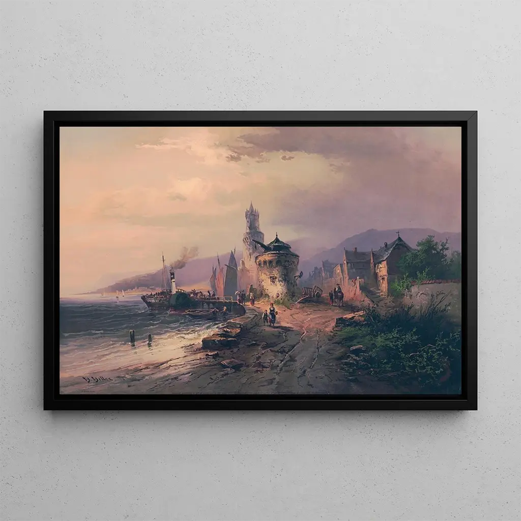 Konsttrycket av Andernach vid Rhen, utfört av Heinrich Hiller, för oss till hjärtat av ett historiskt landskap där floden majestätiskt slingrar sig fram. De mjuka nyanserna av vattnet blandas med reflektionerna av gamla byggnader, vilket skapar en lugn och nostalgisk atmosfär. Hiller's teknik, som förenar realism och romantik, gör det möjligt att känna själen i denna tyska stad. Varje detalj, från seglen på båtarna till träden längs floden, är noggrant återgiven, vilket inbjuder betraktaren att utforska detta konsttryck som en levande scen. Detta verk är en verklig hyllning till harmonin mellan människa och natur.