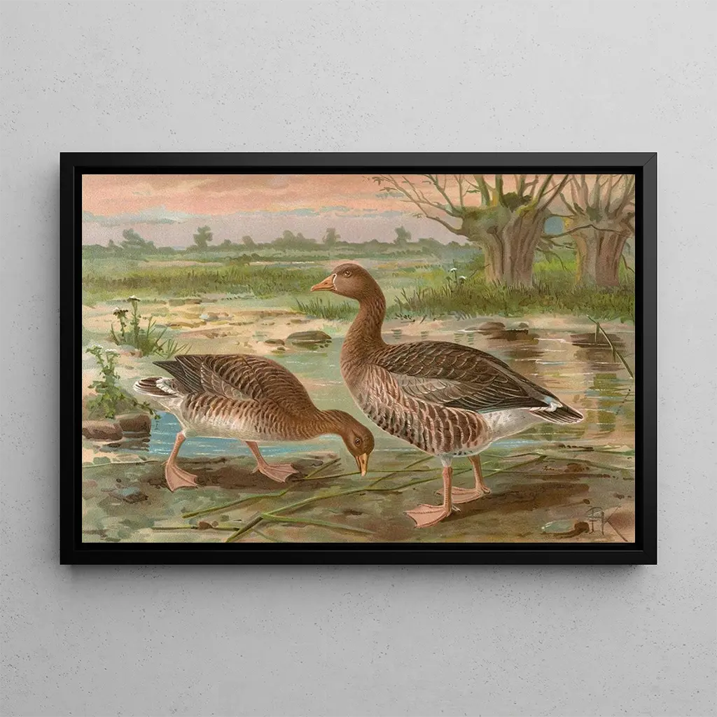 Anser anser : en hyllning till den vilda naturen Konsttrycket Anser anser av Johann Friedrich Naumann fångar den majestätiska skönheten hos grågåsen i dess naturliga habitat. Med delikata färger och noggranna detaljer framkallar detta verk en lugn och kontemplativ atmosfär. Nyansen av brunt och grått blandas harmoniskt, medan den suddiga bakgrunden framhäver huvudmotivet. Tekniken med akvarell, använd med finess, gör det möjligt att återge lättheten hos fjädrarna och rörelsens flyt. Denna livfulla skildring inbjuder betraktaren att fördjupa sig i en värld där naturen råder. Johann Friedrich Naumann : en pionjär inom konstnärlig fågelillustration Johann Friedrich Naumann, verksam på 1800-talet, är erkänd för sin viktiga roll inom fågelillustration. Påverkad av den naturalistiska rörelsen lyckades han förena konst och vetenskap, och erbjöd precisa avbildningar av fåglar från sin tid. Hans passion för att observera fåglar och önskan att immortaliserade dem på duk har gjort honom till en oumbärlig figur inom djurkonsten. Naumann bidrog också till fågelforskningen genom sina skrifter, vilket gör hans verk till en referens för konst- och naturentusiaster. En dekorativ tillgång med många fördelar Konsttrycket av tavlan Anser anser är ett perfekt dekorativt val för olika utrymmen som vardagsrummet, kontoret eller sovrummet. Dess utskriftskvalitet och trohet mot de ursprungliga detaljerna gör det till ett fängslande konstverk som fångar blickar. Genom att integrera detta konsttryck i din inredning tillför du en touch av natur och lugn till din omgivning. Den estetiska dragningskraften hos detta verk, tillsammans med dess rika historia, gör det till ett värdefullt tillskott till varje konstsamling eller vardagsrum.