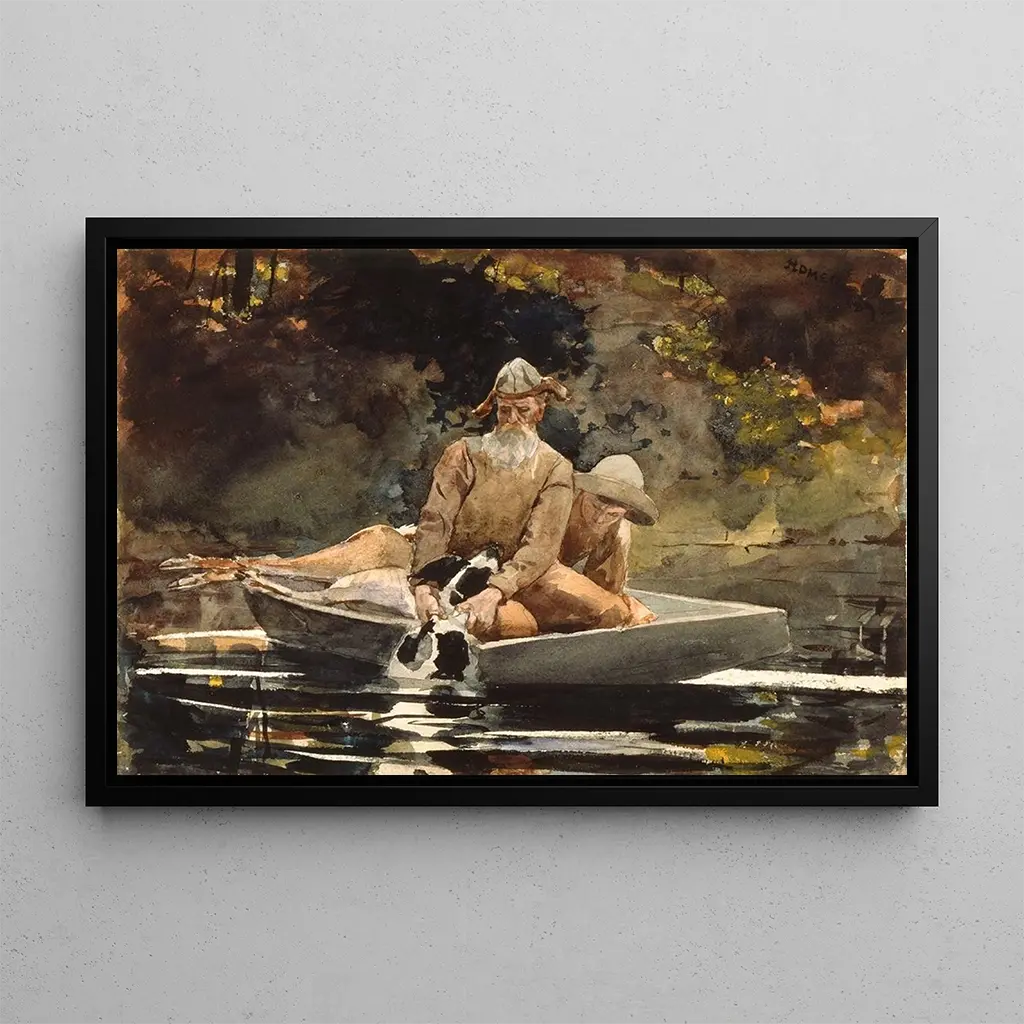 Dans "Après la chasse", Winslow Homer capture un moment de tranquillité après l'effervescence d'une journée de chasse. La composition met en avant un groupe de chasseurs, leurs visages marqués par la fatigue et la satisfaction, tandis que la nature environnante s'étend majestueusement. Les couleurs terreuses et les nuances de vert évoquent une atmosphère à la fois sereine et dynamique, où l'on peut presque entendre le bruissement des feuilles et le chant des oiseaux. La technique de l’aquarelle, si chère à Homer, confère à cette toile une légèreté et une fluidité qui rendent la scène vivante et immersive.