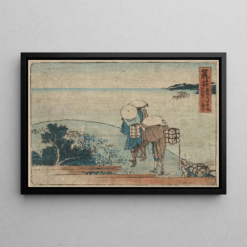 Arai, œuvre emblématique de Katsushika Hokusai, évoque un paysage où la mer et la montagne se rencontrent dans une harmonie saisissante. Les couleurs vives, typiques de l'estampe japonaise, créent une atmosphère à la fois sereine et dynamique. Hokusai, maître de la technique ukiyo-e, utilise des lignes fluides pour capturer le mouvement des vagues, tandis que les nuances de bleu et de vert apportent une profondeur à la scène. Cette reproduction d'Arai invite à une contemplation méditative, où chaque détail semble raconter une histoire, un instant figé dans le temps.