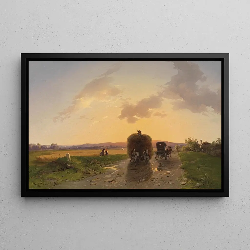 Retour du champ au crépuscule : une ode à la vie rurale Retour du champ au crépuscule, œuvre d'Ignaz Raffalt, évoque la douceur d'une fin de journée à la campagne. Les teintes chaudes de l'orange et du violet se mêlent pour créer une atmosphère paisible, tandis que les silhouettes des paysans rentrant chez eux ajoutent une touche humaine à ce tableau bucolique. La technique de Raffalt, qui allie réalisme et romantisme, permet de ressentir la tranquillité de ce moment suspendu dans le temps. Chaque détail, des champs dorés aux nuages flottants, contribue à une ambiance sereine, invitant à la contemplation et à la nostalgie. Ignaz Raffalt : un témoin de la vie rurale au XIXe siècle Ignaz Raffalt, peintre autrichien du XIXe siècle, est surtout connu pour ses représentations de la vie rurale. Influencé par le mouvement romantique, il a su capturer l'essence des paysages et des scènes de la vie quotidienne avec une sensibilité particulière. Raffalt a passé une grande partie de sa carrière à explorer les campagnes d'Autriche et d'Italie, cherchant à immortaliser la beauté simple de la nature et des traditions paysannes. Son œuvre témoigne d'une époque où la vie rurale était au cœur des préoccupations artistiques, offrant un regard nostalgique sur un mode de vie en mutation. Une acquisition décorative aux multiples atouts La konsttryck de Retour du champ au crépuscule est une pièce décorative qui saura embellir tout espace, qu'il s'agisse d'un salon, d'un bureau ou d'une chambre. Sa qualité d'impression et sa fidélité aux couleurs originales en font un choix idéal pour ceux qui souhaitent apporter une touche de chaleur et de sérénité à leur intérieur. Avec son attrait esthétique, ce tableau invite à la réflexion et à l'évasion, transformant n'importe quel mur en une scène vivante de la beauté rurale.