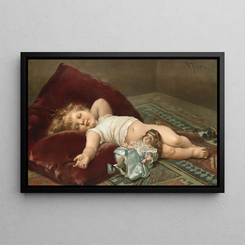 Bébé endormi : une tendresse suspendue dans le temps. La konsttryck de "Bébé endormi" de Virgilio Tojetti capture un moment de pure douceur et d'innocence. La palette de couleurs pastel, avec des nuances de rose et de bleu, évoque une atmosphère paisible et réconfortante. La technique de Tojetti, qui mêle réalisme et sensibilité, permet de ressentir la sérénité de ce petit être endormi. Chaque détail, du léger mouvement des draps aux expressions délicates du visage, crée une connexion émotionnelle forte avec le spectateur. Cette œuvre est une ode à la beauté de l'enfance, invitant à la contemplation et à la tendresse. Virgilio Tojetti : un maître de la peinture de genre. Virgilio Tojetti, peintre italien du XIXe siècle, est connu pour ses scènes de genre et ses portraits empreints de réalisme. Influencé par le romantisme, il a su capturer des moments intimes et émouvants de la vie quotidienne. Tojetti a souvent représenté des enfants, mettant en avant leur innocence et leur beauté naturelle. Sa carrière, bien que moins connue que celle de certains contemporains, a laissé une empreinte durable dans le monde de l'art. "Bébé endormi" est un exemple parfait de son talent, illustrant son habileté à saisir des instants fugaces avec une grande profondeur émotionnelle. Une acquisition décorative aux multiples atouts. Cette konsttryck de "Bébé endormi" est un choix parfait pour apporter une touche de douceur à votre décoration intérieure. Que ce soit dans une chambre d'enfant, un salon ou un bureau, elle crée une ambiance chaleureuse et apaisante. La qualité de l'impression assure une fidélité remarquable à l'œuvre originale, tout en offrant un attrait visuel indéniable. En intégrant cette toile dans votre espace, vous ajoutez une pièce qui évoque tendresse et sérénité, tout en enrichissant votre environnement d'une touche artistique unique. C'est une œuvre qui saura séduire petits et grands, tout en embellissant votre intérieur.