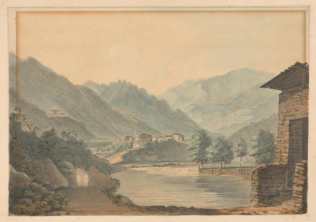 Paysage Montagneux avec Bâtiments et Rivière : en konsttryck mellan natur och arkitektur