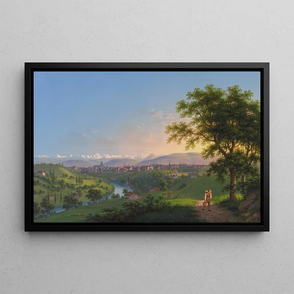Berne : en romantisk vision av schweiziska landskap Konsttrycket av Bern, skapad av Johann Heinrich Bleuler den yngre, förflyttar oss till hjärtat av ett idylliskt landskap. Med sina mjuka nyanser och gröna toner lyckas konstnären fånga lugnet vid floden Aares strand. De noggrant utarbetade detaljerna av historiska byggnader, kombinerat med majestätiska berg i bakgrunden, skapar en lugn och eftertänksam atmosfär. Tekniken med oljemålning gör att Bleuler kan leka med ljuset, framhäva reflektionerna på vattnet och ge liv åt denna pastoral scen. Varje penseldrag verkar berätta en historia och bjuder in betraktaren att fördjupa sig i detta konstverk. Johann Heinrich Bleuler den yngre: en mästare inom romantiska landskap Johann Heinrich Bleuler den yngre, verksam under 1800-talet, är känd för sina landskap som hyllar Schweiz naturliga skönhet. Påverkad av den romantiska rörelsen tillhör han en konstnärlig tradition som värdesätter känslor och personlig uttryckskraft. Hans verk speglar en djup koppling till naturen, ofta präglade av en atmosfär av melankoli och eftertänksamhet. Bleuler lyckades fånga essensen av de platser han målade, vilket gör honom till en oumbärlig konstnär i sin tid. Hans arv består, och hans konsttryck fortsätter att inspirera dem som vill försköna sina hem med scener fyllda av poesi. En dekorativ förvärv med många fördelar Bern-konsttrycket är ett dekorativt föremål som harmoniskt passar in i olika utrymmen, oavsett om det är ett vardagsrum, ett kontor eller ett sovrum. Dess tryckkvalitet garanterar en enastående trohet mot färger och detaljer i originalverket, vilket gör det möjligt att njuta av Bleulers estetik dagligen. Detta konstverk, med sin lugna atmosfär, tillför en känsla av ro och elegans till ditt hem. Genom att välja denna duk, väljer du ett konsttryck som inte bara förskönar din inredning, utan också inbjuder till reflektion och flykt, och gör varje blick till ett ögonblick av eftertanke.