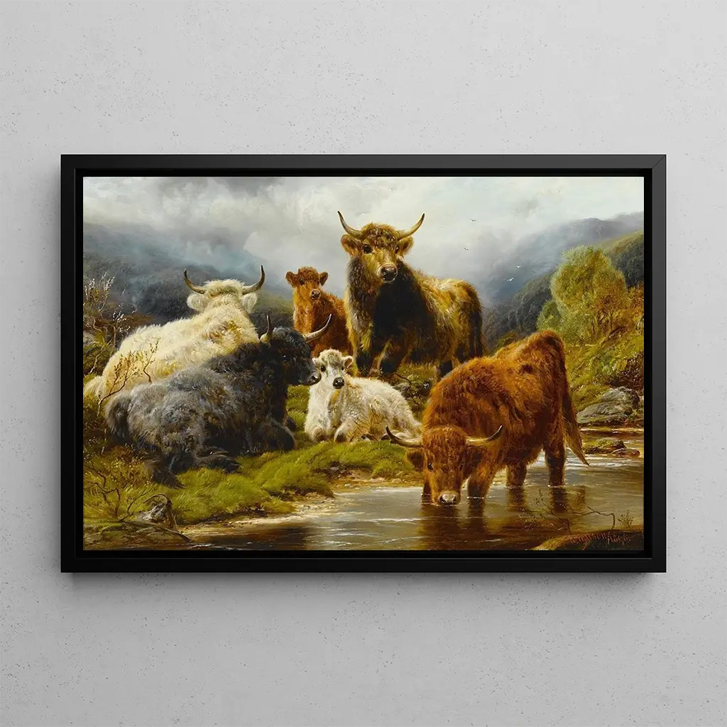 Dans "Bétail des Highlands", Robert Watson nous transporte au cœur des paysages écossais. Cette œuvre, riche en détails, dépeint des bovins majestueux évoluant dans un environnement naturel époustouflant. Les couleurs terreuses dominent, évoquant la robustesse des animaux et la beauté des collines verdoyantes. La technique de l'artiste, mêlant réalisme et impressionnisme, confère à la scène une atmosphère vivante et authentique. Les jeux de lumière et d'ombre ajoutent une profondeur saisissante, rendant presque palpable la brise fraîche des Highlands. Chaque coup de pinceau semble raconter une histoire, celle d'une vie rurale en harmonie avec la nature.