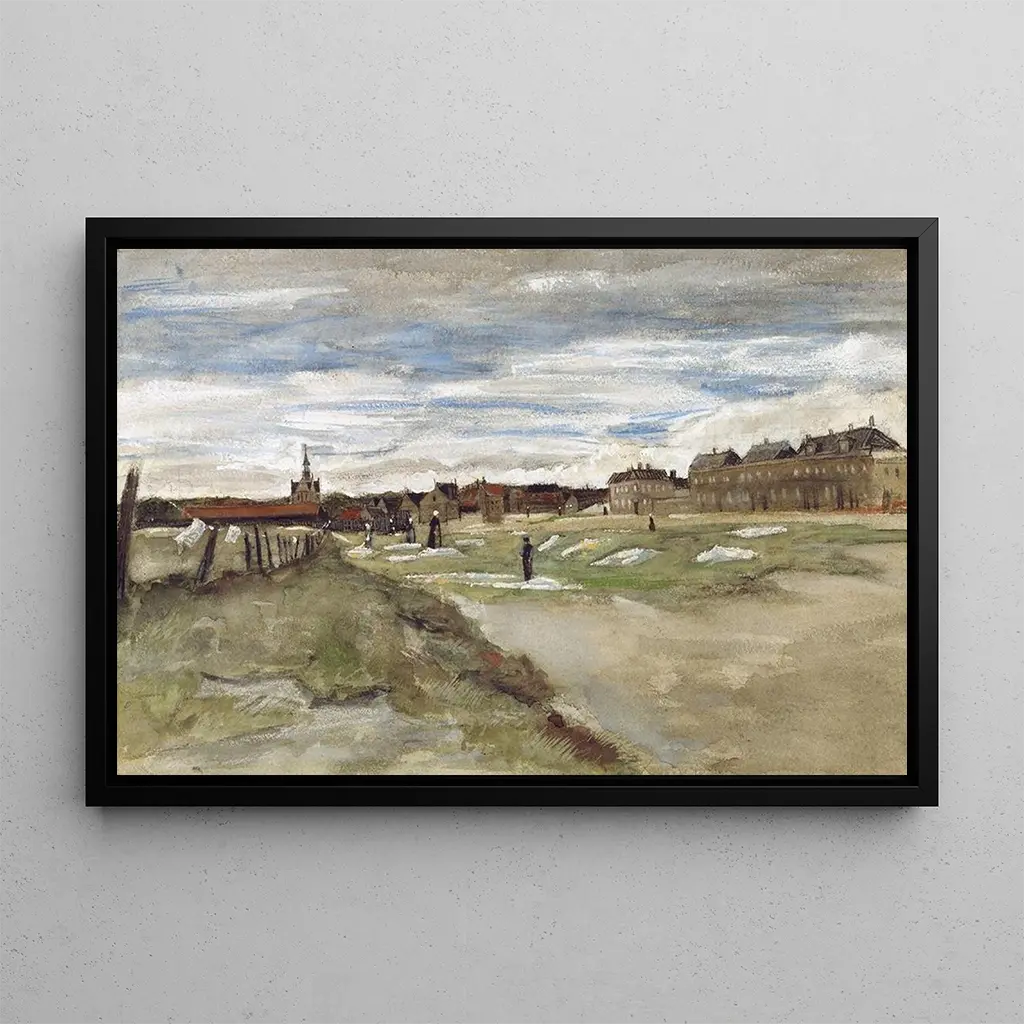 La reproduction de "Blanchisserie à Scheveningen" de Vincent van Gogh capture un moment de la vie quotidienne avec une intensité vibrante. Dans cette scène, les draps blancs flottent au vent, créant un contraste saisissant avec le ciel bleu et les couleurs terreuses des bâtiments environnants. La technique de la touche rapide de Van Gogh, caractéristique de son style post-impressionniste, donne une impression de mouvement et de vie. L'atmosphère est empreinte de simplicité et de chaleur, invitant le spectateur à ressentir la quiétude d'un après-midi en bord de mer, où le travail et la nature se rencontrent harmonieusement.