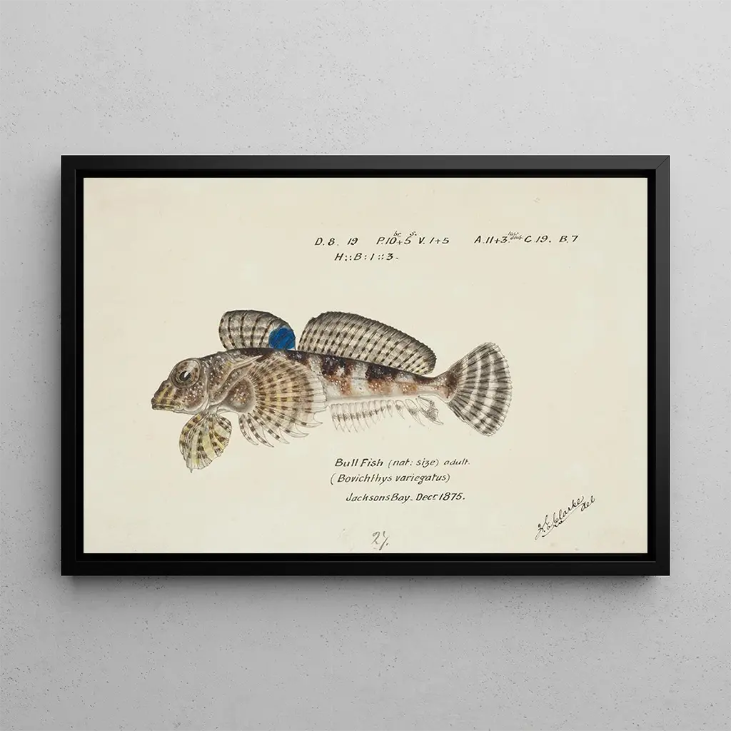 Frank Edward Clarke, konstnär och naturalist från 1900-talet, ägnade sin karriär åt att studera och avbilda marin fauna. Hans arbete kännetecknas av en vetenskaplig metod, men också av en konstnärlig känslighet som gör att han kan fånga essensen av sina motiv. Clarke reste runt i världens hav och hämtade inspiration från den biodiversitet han mötte. Detta konsttryck av Bovichtus variegatus vittnar om hans engagemang för att öka medvetenheten om skönheten och sårbarheten hos marina ekosystem.