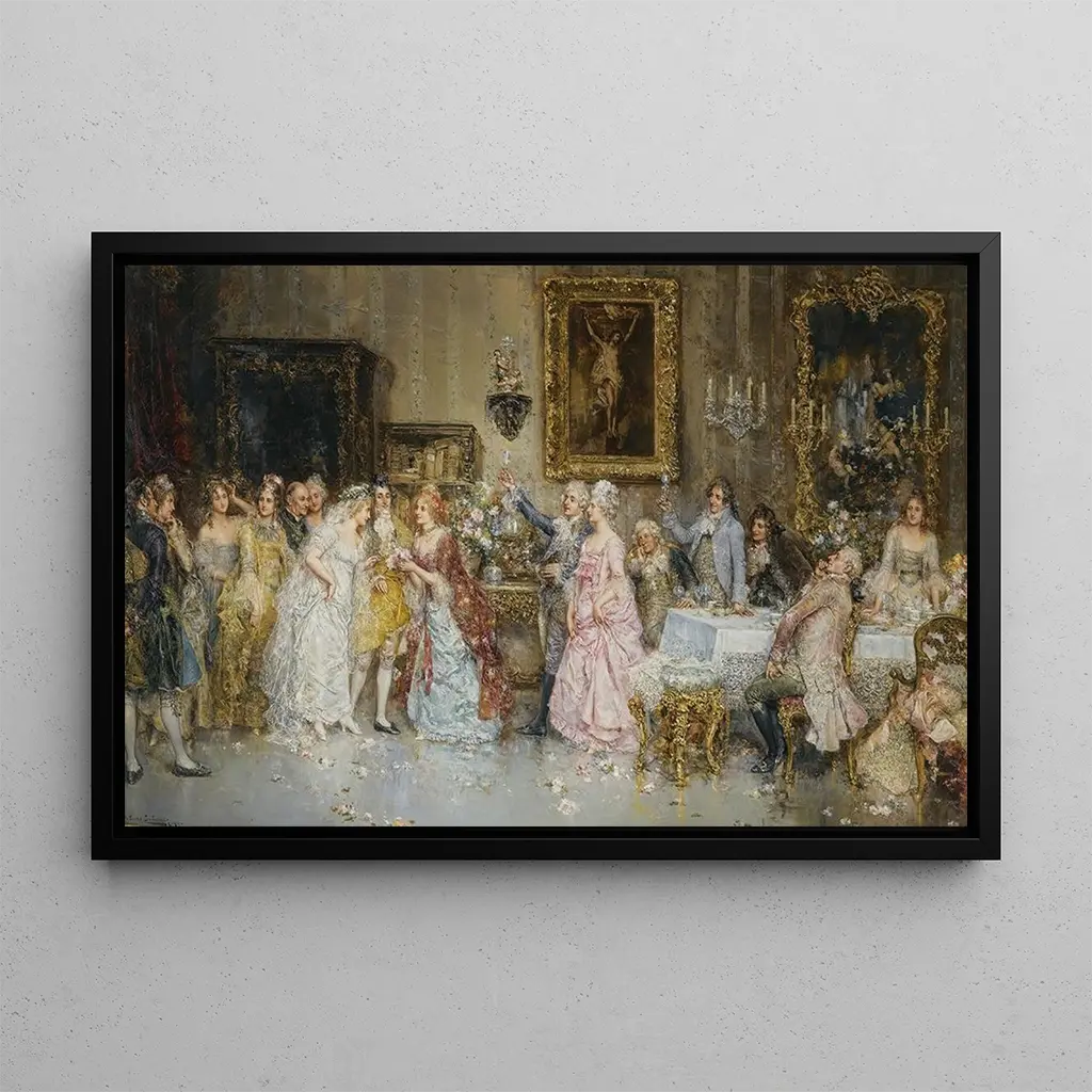 Le Banquet nuptial : une célébration de la vie et de l’amour Le Banquet nuptial de Juan Pablo Salinas est une œuvre vibrante qui évoque la joie et l’intimité d’une célébration. Les couleurs chaudes et lumineuses, telles que les rouges profonds et les ors éclatants, se mêlent pour créer une atmosphère festive et accueillante. La composition dynamique, où les personnages s’entrelacent dans une danse de convivialité, attire immédiatement le regard et invite à la contemplation. La technique de Salinas, qui allie réalisme et touches impressionnistes, donne vie aux détails, des visages souriants aux mets délicatement présentés sur la table. Chaque élément semble raconter une histoire, plongeant le spectateur dans l’effervescence d’un moment partagé. Juan Pablo Salinas : un maître du réalisme latino-américain Juan Pablo Salinas, artiste d’origine latino-américaine, a su capturer l’essence de la culture et des traditions de son époque à travers ses œuvres. Né au début du XXe siècle, il a été influencé par les mouvements artistiques européens tout en intégrant des éléments de son héritage culturel. Salinas a évolué dans un contexte où l’art était un moyen d’exprimer des identités et des récits locaux, ce qui lui a permis de se démarquer par son style unique. Le Banquet nuptial témoigne de cette fusion entre le classicisme et la modernité, tout en célébrant les valeurs communautaires et familiales chères à sa culture. Une acquisition décorative aux multiples atouts La konsttryck du Banquet nuptial est une pièce décorative idéale pour enrichir votre intérieur, que ce soit dans un salon, un bureau ou une chambre. Sa qualité d’impression garantit une fidélité remarquable aux couleurs et aux détails de l’original, permettant ainsi de profiter de l’œuvre comme si vous étiez face à l’original. Avec son attrait esthétique, cette toile devient un point focal captivant qui suscite des conversations et éveille les émotions. Offrir ou s’offrir cette konsttryck, c’est inviter la magie d’un moment festif dans votre quotidien, tout en ajoutant une touche d’élégance à votre décoration intérieure.