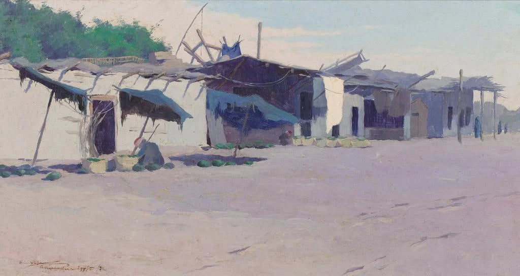 Dans "Cabanes de village à Alexandrie, Égypte", Eric Pape nous plonge au cœur d'un paysage empreint de chaleur et de lumière. Les cabanes, aux teintes terreuses et aux ombres délicates, évoquent une atmosphère de tranquillité et de simplicité. La technique de l'artiste, mêlant aquarelle et huile, crée une harmonie visuelle qui transporte le spectateur dans ce village pittoresque. Les nuances de bleu du ciel se marient avec les couleurs chaudes des bâtiments, tandis que la lumière joue sur les textures, rendant chaque élément vivant. Cette œuvre invite à une contemplation sereine, révélant la beauté des scènes quotidiennes.