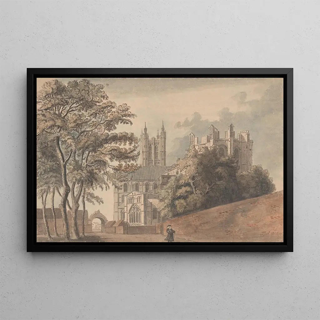 La "Cathédrale de Canterbury Kent", capturée par le Capitaine Francis Grose, est une œuvre qui évoque la majesté et la grandeur de l'architecture médiévale. Les détails minutieux de la façade, avec ses arcs et ses vitraux, sont mis en valeur par des couleurs riches et profondes, allant des bleus apaisants aux dorés éclatants. L'atmosphère solennelle de cette scène invite à la réflexion, tandis que la lumière naturelle accentue les textures des pierres anciennes. Cette toile est non seulement un hommage à un monument emblématique, mais aussi une célébration de l'héritage culturel de l'Angleterre.