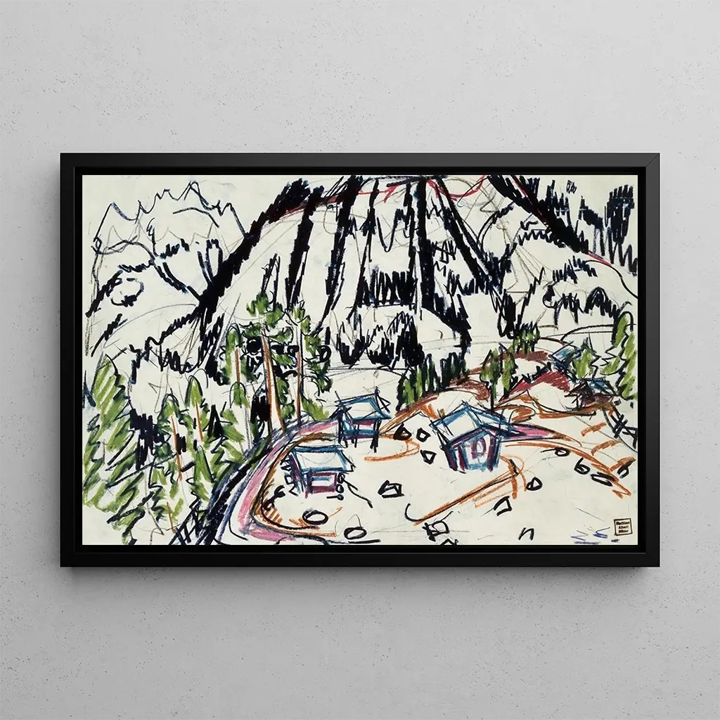 Dans cette reproduction des Chalets alpins Frauenkirch, Albert Müller capture l'essence des paysages montagnards suisses. Les teintes douces de vert et de bleu se mêlent aux nuances chaudes des chalets en bois, créant une atmosphère paisible et accueillante. La technique de l'aquarelle, avec ses dégradés subtils, donne vie à chaque détail, des cimes enneigées aux reflets dans l'eau. Cette œuvre invite à la contemplation, évoquant la tranquillité des Alpes et le charme des constructions traditionnelles qui s'intègrent harmonieusement dans leur environnement naturel.