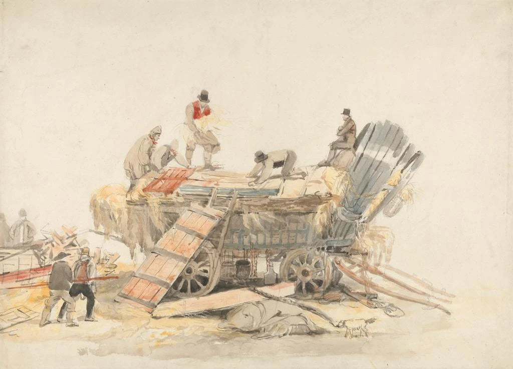 Dans l'œuvre "Chargement d'un chariot", Luke Clennell capture un moment vivant et dynamique de la vie rurale. Les personnages, engagés dans une tâche collective, sont représentés avec une grande attention aux détails, leurs expressions et postures transmettant l'effort et la détermination. Les couleurs terreuses dominent la toile, évoquant la chaleur et la simplicité du travail quotidien. La technique de Clennell, qui mêle aquarelle et gravure, crée une atmosphère à la fois réaliste et poétique, invitant le spectateur à ressentir la camaraderie et l'ardeur des travailleurs.
