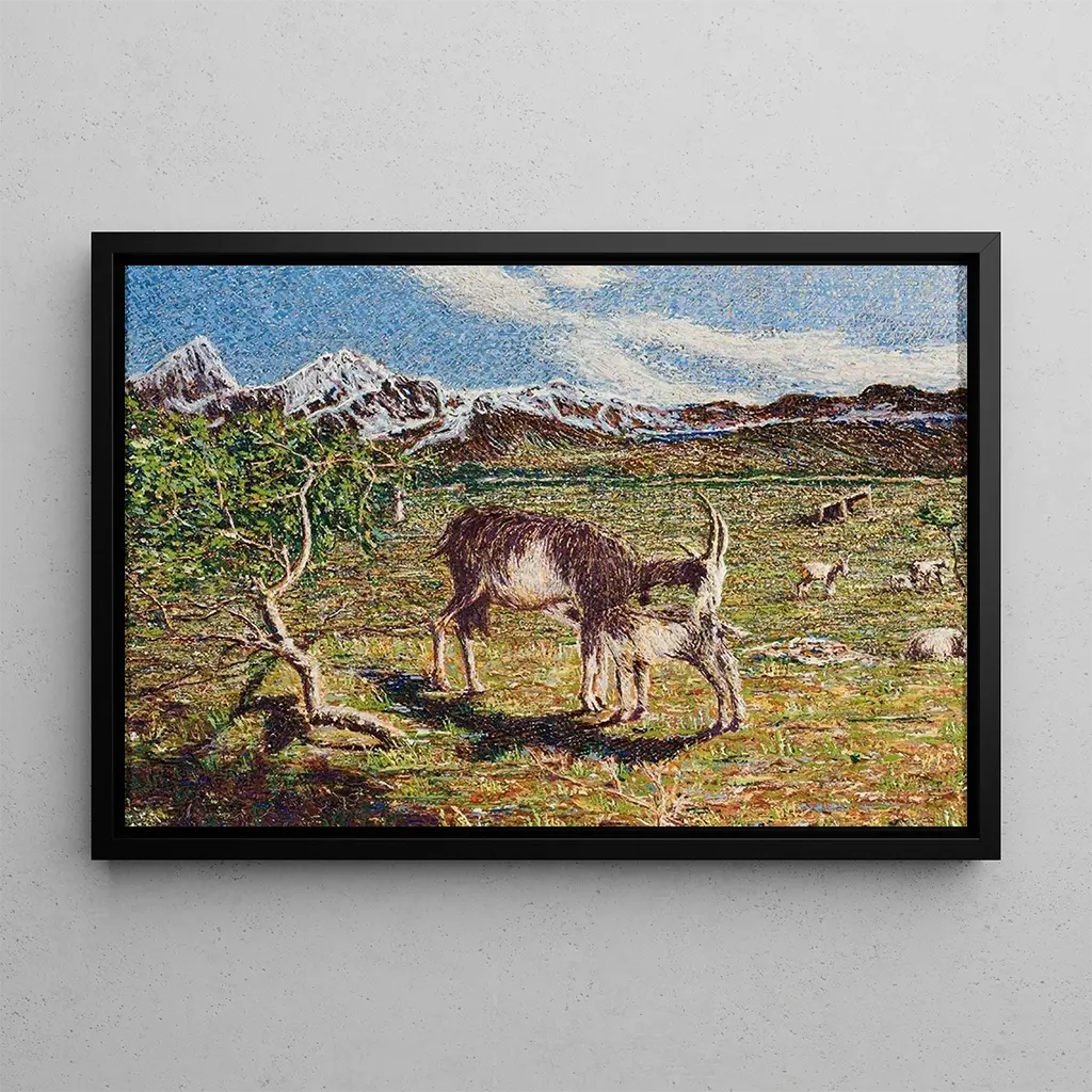 Cette œuvre de Giovanni Segantini, "Chèvres contre paysage", évoque une scène bucolique où la tranquillité règne en maître. Les chèvres, figures centrales de la composition, se détachent sur un fond de montagnes majestueuses et de prairies verdoyantes. La palette de couleurs, dominée par des verts doux et des touches de lumière dorée, crée une atmosphère apaisante et contemplative. La technique de Segantini, mêlant impressionnisme et symbolisme, invite le spectateur à s’immerger dans la beauté de la nature, tout en ressentant une connexion profonde avec les animaux qui l’habitent.