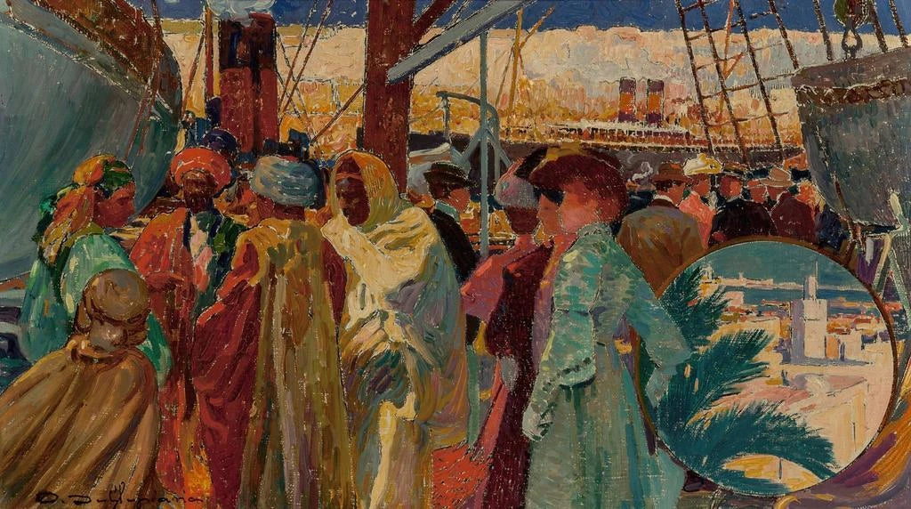 Compagnie Transatlantique Algérie-Tunisie, œuvre de David Dellepiane, évoque un voyage nostalgique sur les mers. Ce tableau, riche en détails, représente une scène maritime animée, où les navires se côtoient dans un cadre vibrant. Les couleurs chatoyantes, allant des bleus profonds aux ocres chaleureux, créent une atmosphère à la fois dynamique et accueillante. Dellepiane, avec sa maîtrise des lumières et des ombres, parvient à capturer l'essence de l'époque des grandes traversées maritimes, invitant le spectateur à s'immerger dans cette aventure.