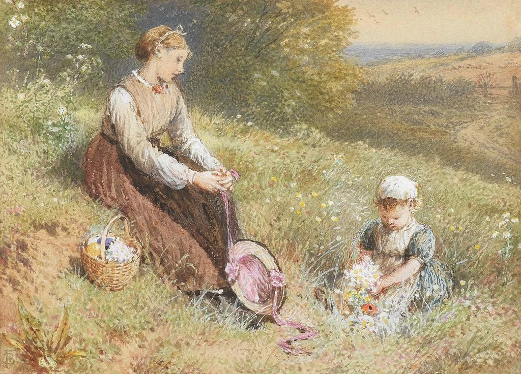 Myles Birket Foster, actif au XIXe siècle, est connu pour ses paysages et ses scènes de la vie rurale. Influencé par le préraphaélisme, il s'attache à représenter la beauté de la nature avec une attention particulière aux détails. Sa carrière, marquée par une exploration constante des effets de la lumière, lui permet de créer des œuvres empreintes de poésie. "Dans le pré" est un exemple parfait de son style, où chaque élément, des fleurs aux personnages, est traité avec soin. Foster a su capturer l'essence même de la vie rurale, faisant de ses œuvres des témoignages précieux d'une époque révolue.