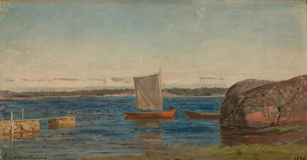 De Hvaler : en maritim scen med en känsla av lugn Den konsttryck av Amaldus Nielsen av De Hvaler fångar den stillsamma skönheten i de norska kustlandskapen. Denna målning skildrar en panoramautsikt över Hvaler-öarna, där havet harmoniskt blandas med landet. Nyansen av blått och grönt smälter mjukt samman och skapar en atmosfär av frid och eftertanke. Nielsen teknik, kännetecknad av flytande penseldrag och noggrann uppmärksamhet på detaljer, gör det möjligt att känna havsbrisen och solens glans på vattnet. Varje element i kompositionen, från klippor till seglen på båtarna, bidrar till en inbjudan till flykt. Amaldus Nielsen : en mästare av det skandinaviska landskapet Amaldus Nielsen, verksam under 1800-talet, är erkänd för sina maritima landskap och sina skildringar av den norska naturen. Påverkad av romantiken speglar hans verk en djup beundran för den vilda skönheten i hans födelseland. Nielsen lyckades fånga ljusets och färgernas essens, vilket gav honom en viktig plats i den skandinaviska konsthistorien. Hans resor genom Norge berikade hans stil och gav honom möjlighet att utforska olika tekniker och perspektiv. Konsttrycket av De Hvaler vittnar om hans exceptionella talang och hans engagemang för en autentisk skildring av landskap. En dekorativ förvärv med många fördelar Konsttrycket av De Hvaler är ett perfekt dekorativt föremål för att försköna ditt vardagsrum, kontor eller sovrum. Dess tryckkvalitet garanterar en anmärkningsvärt trogen återgivning av färger och detaljer i det ursprungliga verket, vilket tillför en touch av elegans till ditt hem. Denna tavla, med sin lugna atmosfär, inbjuder till avkoppling och eftertanke, och gör varje blick till ett ögonblick av frid. Genom att integrera detta konsttryck i din inredning, tillför du inte bara ett konstverk, utan också ett fönster öppet mot Norges naturliga skönhet, vilket berikar ditt boende.