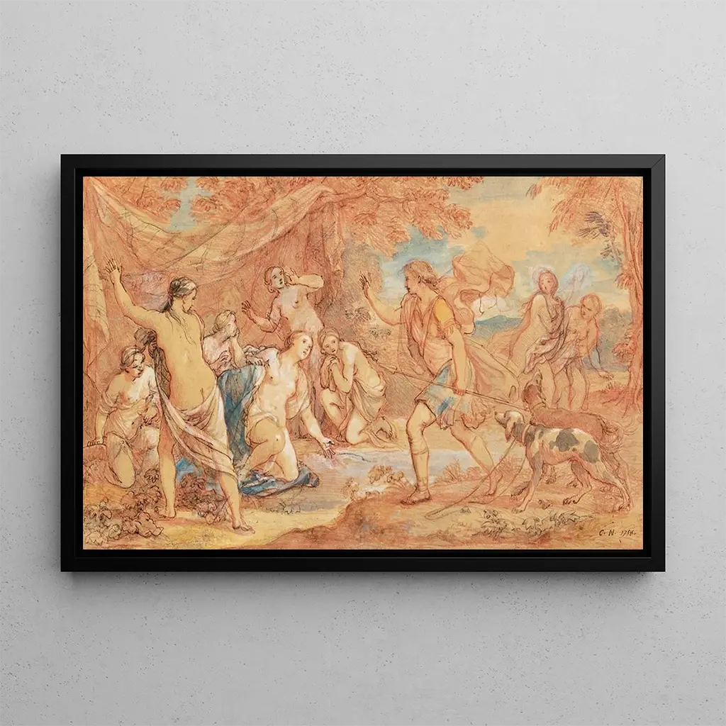 Dans cette reproduction de Diane et Actéon, Charles-Joseph Natoire capture un moment de tension dramatique entre les deux personnages mythologiques. La composition dynamique, où les corps s'entrelacent, est accentuée par une palette de couleurs chaudes et des jeux d'ombres qui créent une atmosphère à la fois sensuelle et tragique. Les détails minutieux des drapés et des expressions faciales témoignent du talent de Natoire pour rendre la vie et l’émotion à travers la peinture. Le regard de Diane, à la fois surpris et furieux, contraste avec la posture vulnérable d'Actéon, offrant une interprétation captivante de ce mythe classique.