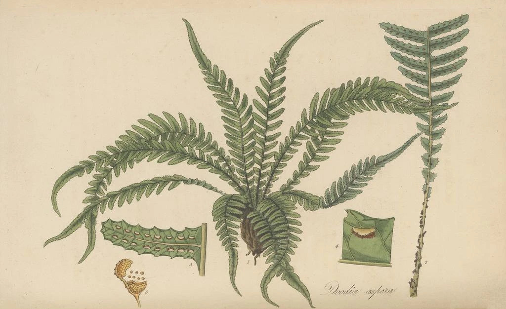 William Jackson Hooker, brittisk botaniker och illustratör från 1800-talet, spelade en avgörande roll i dokumentationen av den globala floran, särskilt den australiensiska. Hans arbete påverkades av de botaniska expeditioner som ägde rum under hans tid, och han lyckades förena vetenskap och konst i sina illustrationer. Hooker var den förste direktören för Kew botaniska trädgård, där han bidrog till klassificeringen och bevarandet av växtarter. Doodia Aspera är ett perfekt exempel på hans noggranna metod och engagemang för naturen, vilket vittnar om botaniken som en viktig del av förståelsen av vår miljö.