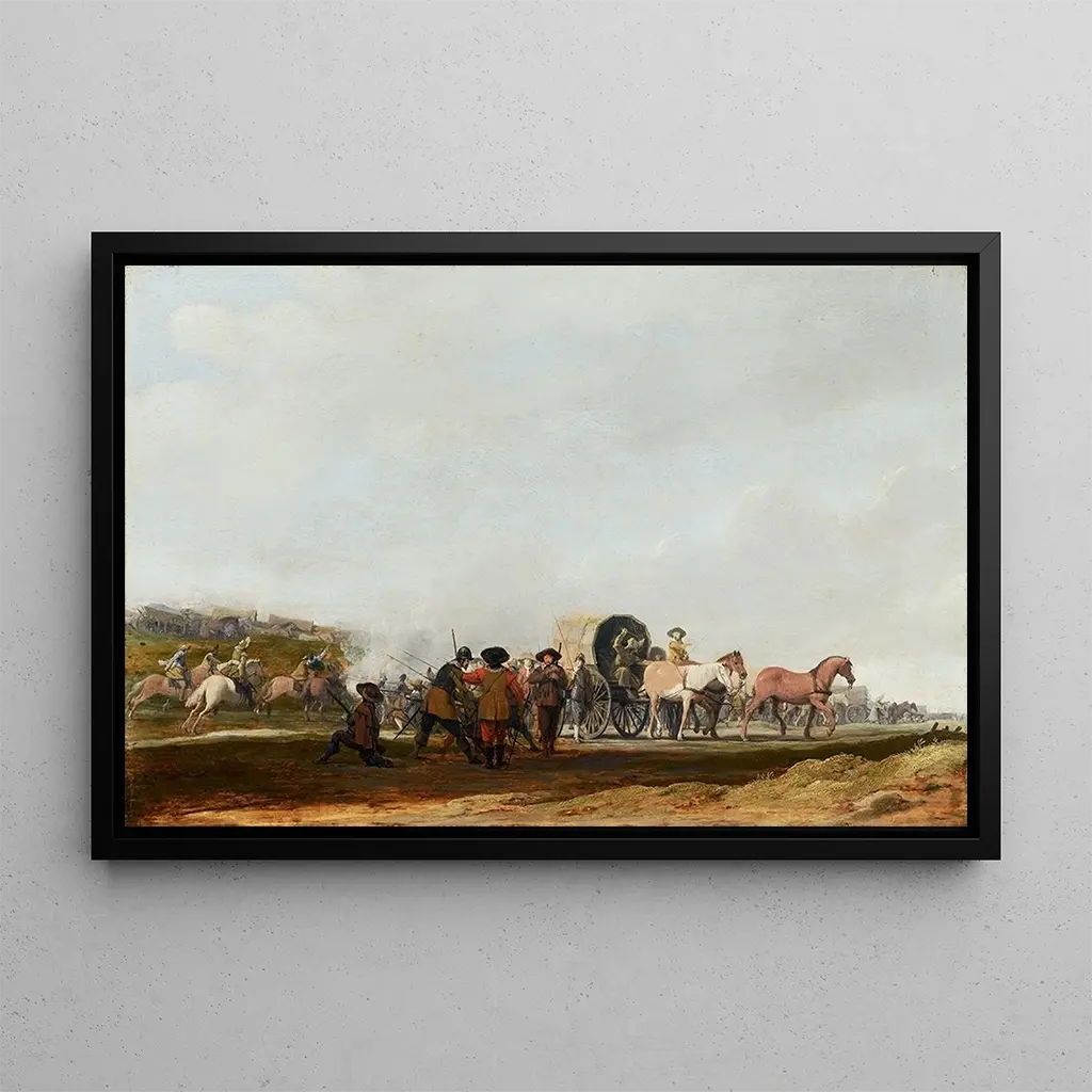 L'œuvre "Embuscade d'un convoi militaire" de Pieter Post dépeint une scène de guerre où la tension est palpable. Les couleurs sombres et terreuses dominent, créant une atmosphère de danger imminent. La composition dynamique, avec des soldats en mouvement et des éléments de paysage qui encadrent l'action, attire le regard et plonge le spectateur au cœur de l'affrontement. La technique de Post, mêlant réalisme et détails minutieux, permet de ressentir l'adrénaline du moment, tandis que les ombres et la lumière jouent un rôle crucial dans la mise en scène de cette embuscade.