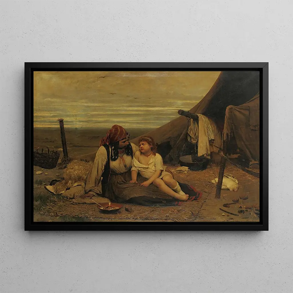 Antoni Kozakiewicz, peintre polonais du XIXe siècle, est souvent associé au mouvement romantique, qui valorise l’émotion et l’individualité. Influencé par les traditions artistiques de son époque, il s’est spécialisé dans la représentation de scènes de la vie quotidienne, mettant en avant des sujets souvent marginalisés. Sa carrière, bien que moins connue que celle de ses contemporains, témoigne d’un profond respect pour les cultures qu’il dépeint. "Une famille gitane" illustre parfaitement son intérêt pour les modes de vie alternatifs et son désir de capturer l’âme humaine à travers l’art, faisant de lui un acteur important de la scène artistique de son temps.