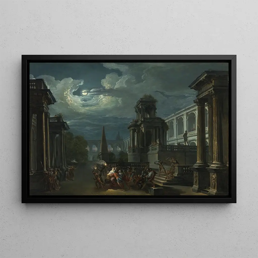 Giovanni Paolo Panini, actif au XVIIIe siècle, est surtout connu pour ses paysages et ses scènes historiques. Son style, influencé par le baroque, se caractérise par une grande richesse de détails et une composition soigneusement équilibrée. Panini a su capturer l'imaginaire collectif de son époque, en intégrant des éléments de la mythologie et de l'histoire dans ses œuvres. "L'Enlèvement d'Hélène" est emblématique de son talent pour raconter des histoires à travers l'art, tout en reflétant les préoccupations culturelles et sociales de son temps. Son héritage perdure, inspirant les générations d'artistes qui suivent.