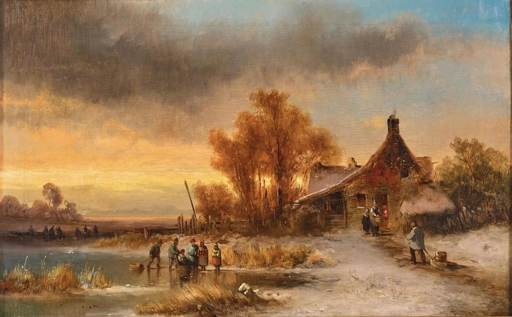 L'œuvre "Étang enneigé au coucher du soleil" d'Anton Doll capture la magie d'un paysage hivernal. La toile déploie des nuances de bleu et d'orange, où le ciel embrase l'horizon tandis que la neige scintille sous les derniers rayons du soleil. La technique de Doll, mêlant réalisme et impressionnisme, crée une atmosphère paisible, presque méditative. Les détails délicats des arbres dénudés et le reflet du ciel sur l'étang ajoutent une dimension poétique à cette scène, invitant le spectateur à s'évader dans ce tableau enchanteur.
