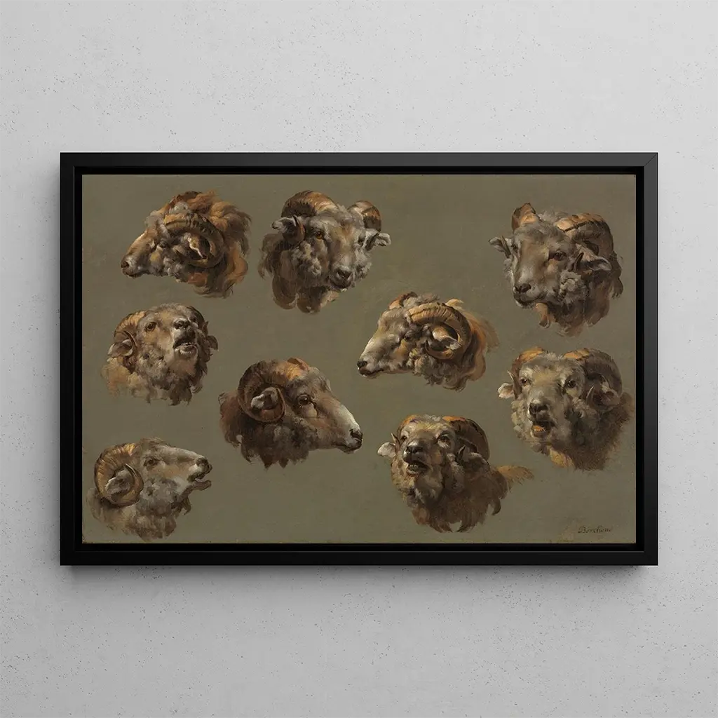 La reproduction Études de têtes de bélier, œuvre anonyme, présente une série de portraits captivants de ces animaux majestueux. Les détails minutieux des traits et des textures de la laine sont mis en valeur par une palette de couleurs naturelles, allant des bruns chauds aux gris subtils. Cette toile, à la fois réaliste et expressive, capte l'essence même de ces créatures, évoquant leur force et leur caractère. L'atmosphère qui se dégage de cette œuvre est à la fois sauvage et sereine, invitant à une contemplation des merveilles de la faune.