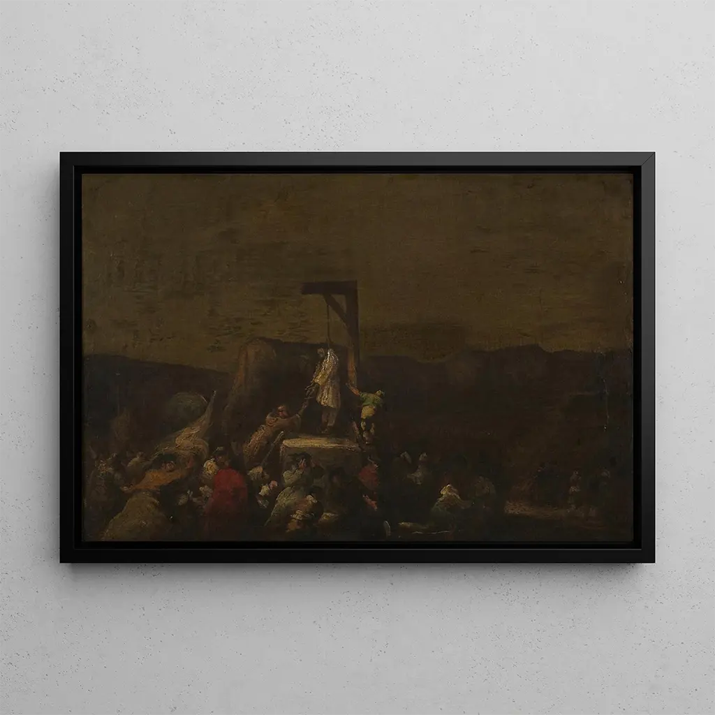 La Pendaison, verk av Eugenio Lucas Velázquez, skildrar en dramatisk scen där ett tragiskt öde för en man utspelar sig inför en fascinerad publik. De mörka färgerna och de förhöjda skuggorna skapar en atmosfär av spänning och melankoli. Velázquez tekniska skicklighet visar sig i de slående detaljerna i ansiktsuttryck och karaktärernas poser, vilket gör scenen ännu mer emotionell. Detta konsttryck, både kraftfullt och störande, konfronterar oss med den brutala verkligheten av den mänskliga tillvaron och uppmanar oss att reflektera över rättvisa och moral.