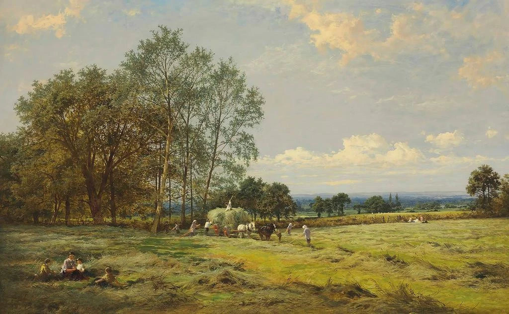 Benjamin Williams Leader, actif à la fin du XIXe siècle, est reconnu pour ses paysages lumineux et ses scènes de la vie rurale. Influencé par le mouvement préraphaélite, il a su capturer la lumière et la couleur avec une précision remarquable. Leader a également été un membre actif de la Royal Academy, ce qui témoigne de son importance dans le paysage artistique britannique. "Faneurs" est une œuvre emblématique qui illustre son talent pour représenter la beauté de la campagne anglaise, tout en mettant en avant le travail acharné des agriculteurs. Son style unique continue d'inspirer les amateurs d'art aujourd'hui.