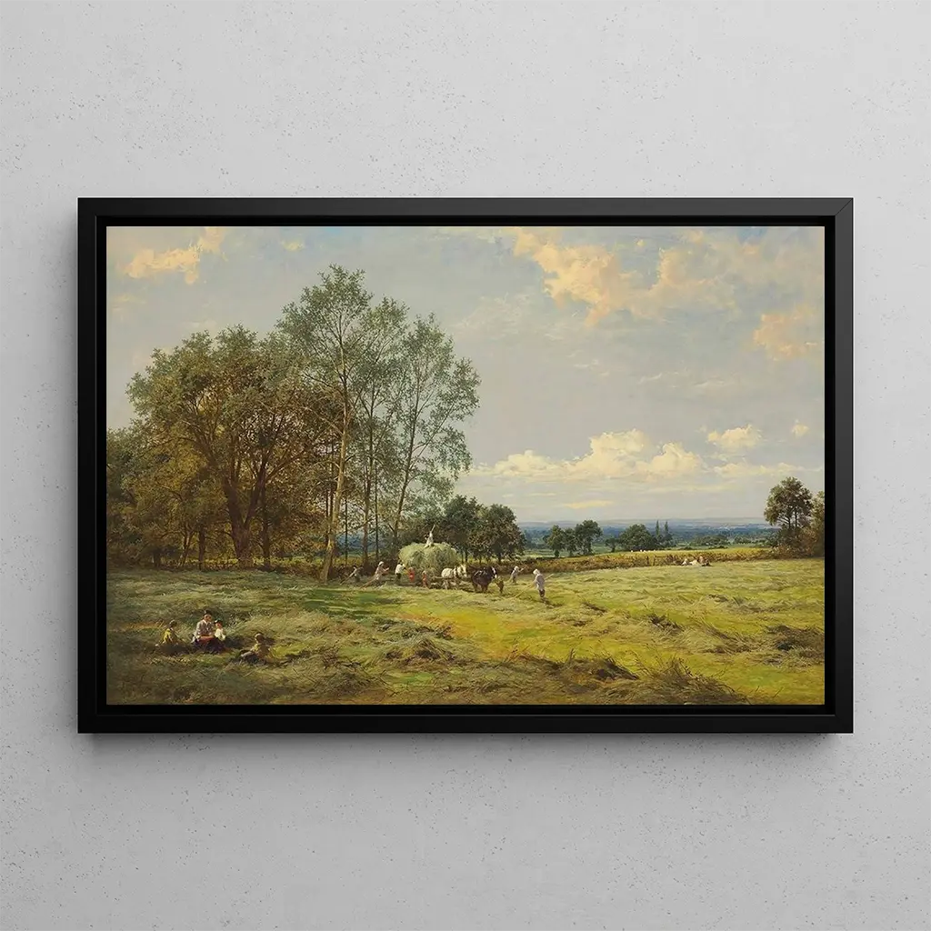 "Faneurs" de Benjamin Williams Leader est une œuvre qui célèbre la vie rurale et la beauté des paysages anglais. La toile dépeint des paysans au travail, entourés de champs dorés et d'un ciel bleu éclatant. Les couleurs vibrantes et les jeux de lumière capturent l'essence d'une journée ensoleillée, créant une atmosphère de joie et de sérénité. La technique de Leader, marquée par des coups de pinceau dynamiques, donne vie à chaque personnage et à la nature environnante. Cette reproduction du tableau "Faneurs" invite à une immersion dans un monde pastoral, où le travail et la nature s'harmonisent.