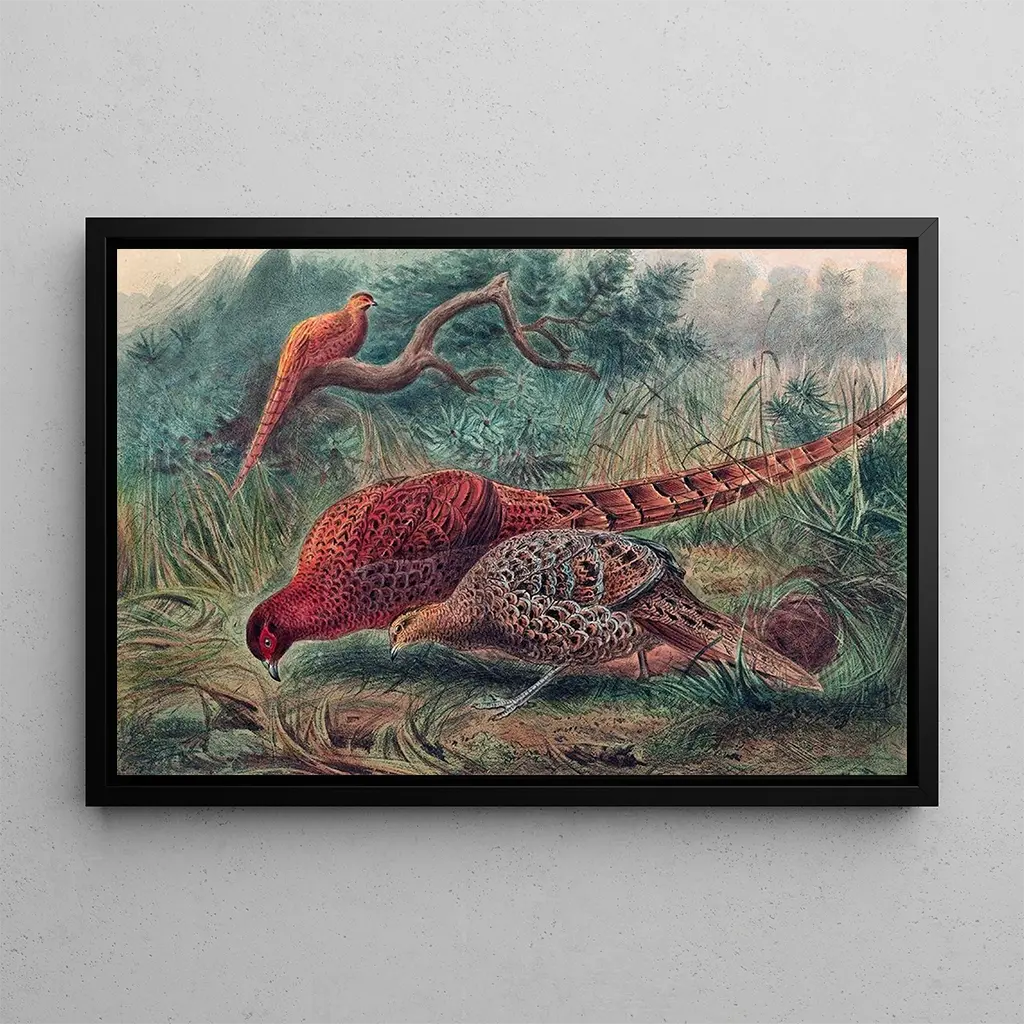 Konsttrycket "Faisan de Soemmerring" av Joseph Wolf är ett livfullt verk som fångar djurens prakt. Kompositionen framhäver en majestätisk faisan, vars skimrande fjädrar glittrar i ljuset och avslöjar en rik färgpalett som sträcker sig från guld till smaragdgrönt. Tekniken med akvarell, mästerligt utförd av Wolf, ger en lätthet till hela verket, medan den suddiga bakgrunden antyder en naturlig miljö, nästan drömlik. Atmosfären som avtecknar sig i detta konsttryck inbjuder till ett lugnt betraktande, där observatören nästan kan höra fåglarnas sång och känna den lätta brisen.