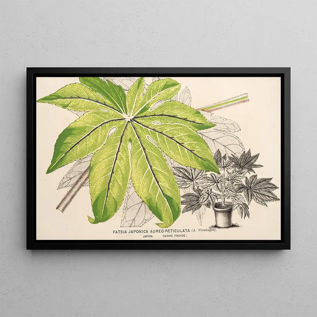 La reproduction Fatsia japonica aureoreticulata nous plonge dans un univers végétal fascinant, où les feuilles larges et découpées s'entrelacent dans une harmonie de verts éclatants. Les nuances dorées qui ponctuent les nervures des feuilles ajoutent une dimension lumineuse, évoquant les rayons du soleil filtrant à travers un feuillage luxuriant. Cette œuvre, à la fois réaliste et poétique, capte l'essence même de la nature, invitant à la contemplation et à la sérénité. La technique de l'artiste, qui joue avec la lumière et l'ombre, crée une atmosphère apaisante, idéale pour embellir un espace de vie.