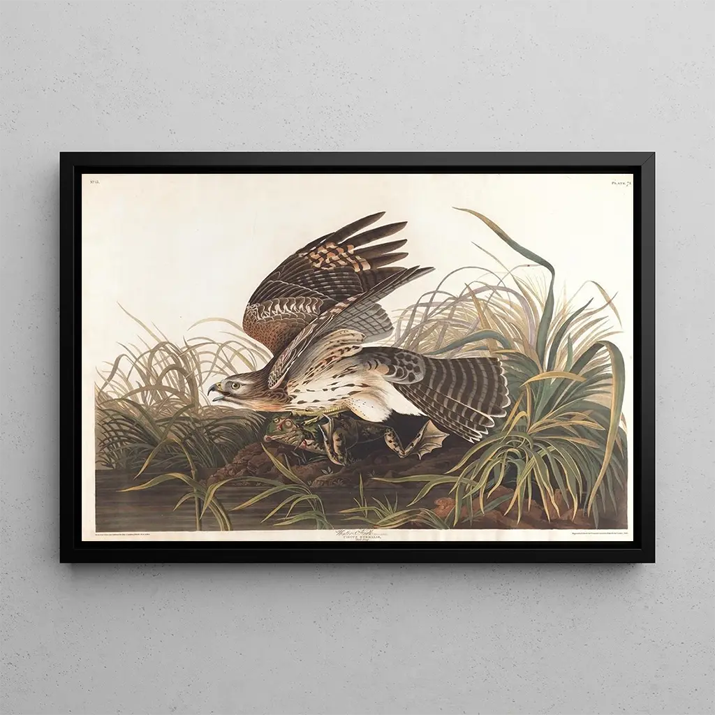 John James Audubon, né en Haïti en 1785, est un naturaliste et artiste célèbre pour ses études ornithologiques. Son œuvre, qui s'étend sur plusieurs décennies, a révolutionné la manière dont les oiseaux étaient représentés dans l'art. Influencé par le romantisme et le réalisme, Audubon a voyagé à travers l'Amérique du Nord pour observer et dessiner des espèces aviaires dans leur habitat naturel. Son approche scientifique et artistique a permis de documenter des espèces menacées et a contribué à la sensibilisation à la conservation. "Faucon d'hiver" est l'une de ses œuvres emblématiques, illustrant son talent exceptionnel et son dévouement à la nature.