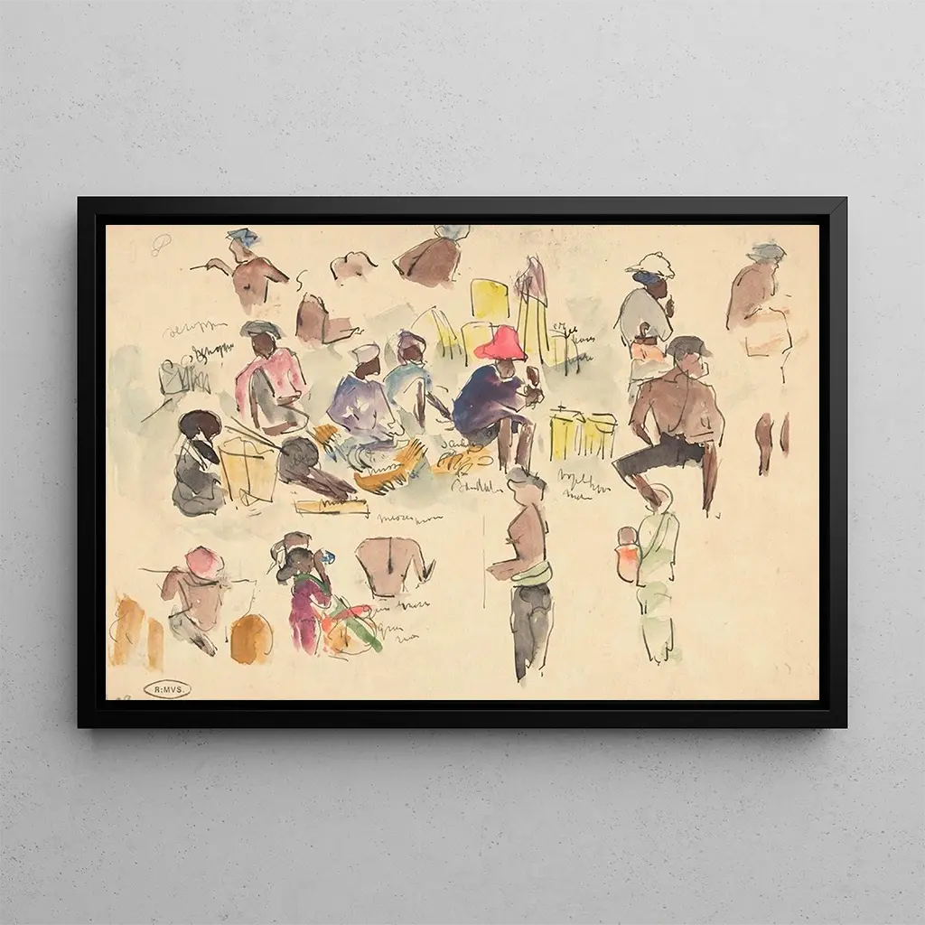 Figures Indigènes : en hyllning av kulturell mångfald Konsttrycket "Figures Indigènes" av Pierre Jean Apol förmedlar en rikedom av färger och former som fångar själva essensen av livet och traditionerna hos ursprungsbefolkningarna. Figurerna, klädda i traditionella dräkter, tycks komma till liv under konstnärens penseldrag, varje detalj avslöjar en unik historia. Jord- och växtnyanser blandas harmoniskt och skapar en atmosfär som är både livfull och lugnande. Verket bjuder in betraktaren att fördjupa sig i en värld där natur och mänsklighet samexisterar i perfekt symbios, och erbjuder en djupt immersiv visuell upplevelse. Pierre Jean Apol : ett vittne till sin tid Pierre Jean Apol, verksam på 1800-talet, är erkänd för sitt engagemang att skildra kulturer och landskap från sin epok. Påverkad av den romantiska rörelsen ägnade han sig åt att måla genrebilder och landskap, och lyfte fram skönheten i folkliga traditioner. Hans arbete präglas av en känslighet för naturen och levnadssätten hos de folkgrupper han mötte. "Figures Indigènes" ingår i en period då intresset för exotism och kulturell mångfald var på frammarsch, och vittnar om konstnärens roll som en vägvisare för förståelse och uppskattning av olikheter. En dekorativ tillgång med många fördelar Konsttrycket av "Figures Indigènes" är ett dekorativt föremål som tillför en äkthetskänsla och värme till ditt hem, oavsett om det är i ett vardagsrum, ett kontor eller ett sovrum. Dess tryckkvalitet garanterar trohet mot färger och detaljer i originalverket, vilket gör att du kan njuta fullt ut av den visuella rikedom det erbjuder. Genom att välja detta konsttryck gör du ett val som inte bara förskönar ditt utrymme, utan också berättar en historia, väcker nyfikenhet och beundran hos dina gäster. Denna väggdekoration är en verklig estetisk tillgång, som kan förvandla vilken vägg som helst till ett fönster öppet mot andra kulturer.