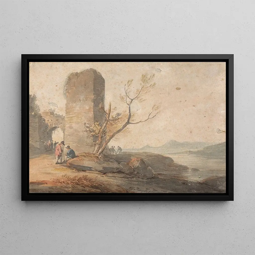 Konsttrycket av Figuren nära en ruinad båge av William Payne fördjupar oss i ett landskap fyllt av nostalgi. Denna duk, utförd med jordnära nyanser och gröna inslag, framkallar en atmosfär som är både lugn och melankolisk. Personerna, klädda i traditionella kläder, verkar smälta samman med omgivningen, medan den ruinade bågen symboliserar tidens gång och livets skörhet. Paynes teknik, som kombinerar akvarell och olja, skapar en slående djupkänsla och bjuder in betraktaren att betrakta naturens detaljer och känna den emotion som avges.