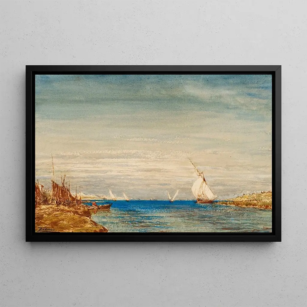 Konsttryck Pêcheurs av Félix Ziem framkallar en livlig och dynamisk scen av maritimt liv, där män sysselsätter sig vid vattnet. Detta verk, genomsyrat av ljus, lyfter fram fiskare i aktion, deras silhuetter skär sig mot en glittrande havsbotten. De varma färgerna och nyanser av blått skapar en livfull, nästan påtaglig atmosfär. Ziem, med sin mästerlighet i ljus och vatten, lyckas förmedla en känsla av rörelse och liv, vilket gör detta konsttryck fängslande och immersivt.