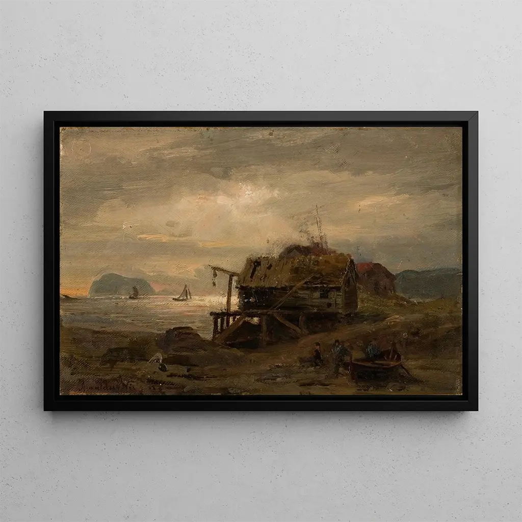 Född 1838, är Amaldus Nielsen en erkänd dansk konstnär för sina maritima landskap och scener ur vardagslivet. Påverkad av romantikens rörelse, lyckades han fånga den naturliga skönheten i Skandinavien genom sina verk. Nielsen levde i en tid då skandinavisk konst började göra sig ett namn på den internationella scenen, och hans målningar, som "Fiskarstugor i Kinn", vittnar om denna utveckling. Hans stil, kännetecknad av noggrann uppmärksamhet på detaljer och en palett av delikata färger, gjorde att han stack ut bland sina samtida och lämnade ett varaktigt arv inom dansk konst.