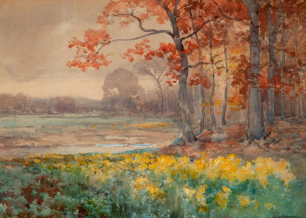 Julian Onderdonk, actif au début du XXe siècle, est reconnu pour ses paysages et ses natures mortes, souvent inspirés par la flore texane. Élevé dans un milieu artistique, il a été influencé par ses contemporains impressionnistes, mais a su développer un style unique qui lui est propre. Ses œuvres, telles que "Fleurs jaunes par un jour gris", témoignent de son amour pour la nature et de son désir de capturer des moments de beauté fugace. Onderdonk a su marier la lumière et la couleur pour créer des compositions qui évoquent des émotions profondes, faisant de lui une figure incontournable de l'art américain.