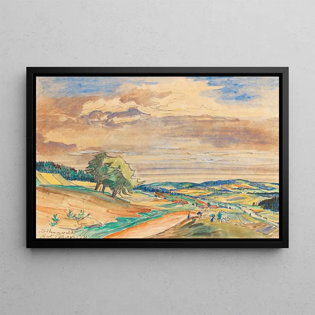 Forêt de Bohême : une évasion au cœur de la nature sauvage La reproduction Forêt de Bohême d'Anton Emanuel Peschka nous transporte dans un monde où la nature règne en maître. Les nuances de verts profonds et de bruns chaleureux s’entrelacent pour créer une atmosphère à la fois paisible et mystérieuse. La technique de l'huile sur toile permet à l'artiste de capturer la lumière filtrant à travers les feuillages, ajoutant une dimension presque vivante à cette scène forestière. Chaque détail, des troncs d'arbres majestueux aux feuilles délicates, évoque une invitation à la contemplation et à la rêverie, faisant de cette œuvre un véritable havre de paix. Anton Emanuel Peschka : un maître de la peinture paysagère Anton Emanuel Peschka, actif au début du XXe siècle, est reconnu pour ses paysages évocateurs qui célèbrent la beauté de la nature. Influencé par le mouvement impressionniste, il développe un style caractérisé par des coups de pinceau dynamiques et une palette riche. Peschka, originaire de Bohême, puise son inspiration dans les paysages de sa terre natale, cherchant à capturer l'essence de chaque lieu. Son œuvre, bien que moins connue que celle de ses contemporains, joue un rôle essentiel dans l'évolution de la peinture de paysage en Europe, témoignant d'une sensibilité unique envers la nature. Une acquisition décorative aux multiples atouts La reproduction du tableau Forêt de Bohême est une pièce décorative qui s'intègre harmonieusement dans divers espaces, que ce soit un salon chaleureux, un bureau inspirant ou une chambre apaisante. Sa qualité d'impression garantit une fidélité aux couleurs et aux détails de l'œuvre originale, offrant un attrait esthétique indéniable. En choisissant cette toile, vous ajoutez non seulement une touche artistique à votre intérieur, mais aussi un élément de sérénité qui invite à la détente et à l'évasion. C'est une acquisition qui enrichit votre décor tout en célébrant la beauté intemporelle de la nature.
