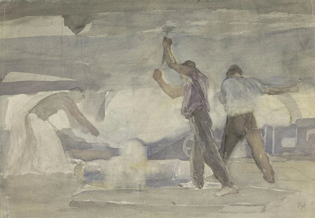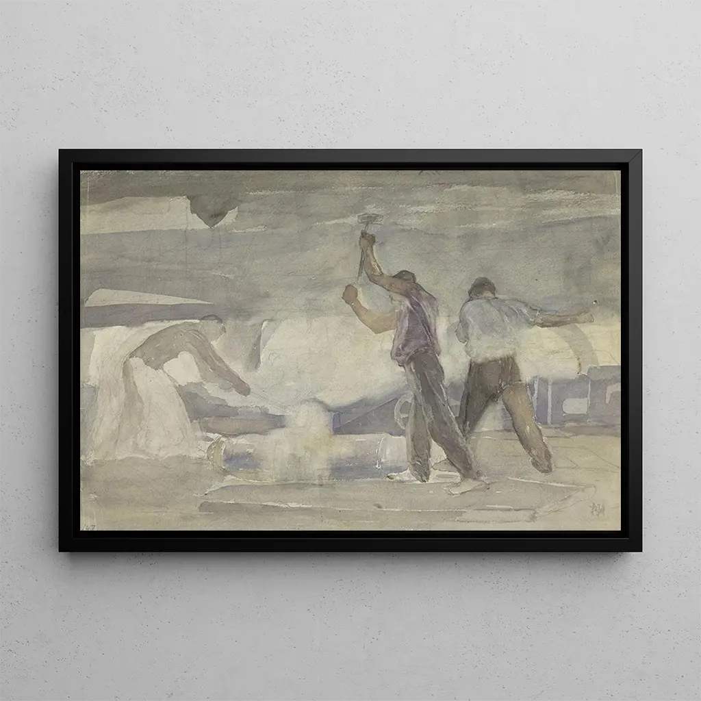 Dans cette reproduction de Forge, Pieter Josselin de Jong nous plonge dans un univers de travail acharné, où la lumière joue avec les ombres des forgerons. Les couleurs chaudes, dominées par des nuances de rouge et d’orange, évoquent la chaleur du feu et l’énergie de l’effort humain. La technique de l’artiste, qui mêle réalisme et touches impressionnistes, crée une atmosphère vibrante et dynamique, presque palpable. Chaque détail, du souffle de la forge aux visages concentrés des ouvriers, raconte une histoire de passion et de dévouement, invitant le spectateur à ressentir l’intensité de ce moment figé dans le temps.