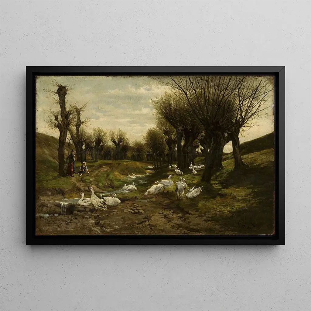 Oies le long d'un ruisseau : en scen bucolic präglad av lugn I denna konsttryck av Oies le long d'un ruisseau fångar Richard Lorenz den stillsamma skönheten i naturen. Gäss, majestätiska och lugna, rör sig längs en fridfull vattendrag, medan solljuset leker på vattenreflexerna. De mjuka och naturliga färgerna, från lugnande grönt till kristallklart blått, skapar en atmosfär av lugn och eftertanke. Lorenz teknik, som blandar realism och impressionism, inbjuder betraktaren att fördjupa sig i denna idylliska scen, där varje detalj, från gässen fjädrar till vattnets vågor, är noggrant observerad. Richard Lorenz : en mästare av landskap under 1800-talet Richard Lorenz, tysk landskapsmålare från 1800-talet, är erkänd för sin förmåga att förmedla den naturliga skönheten i landskap. Påverkad av romantikrörelsen, ägnade han sig åt att skildra naturen och sökte framkalla känslor genom sina verk. Hans stil, kännetecknad av noggrann uppmärksamhet på detaljer och en harmonisk färgpalett, speglar naturens betydelse i samtida konst. Lorenz lyckades fånga essensen av europeiska landskap, och hans bidrag till landskapskonsten förblir betydande, vilket gör honom till en oumbärlig konstnär för konstälskare. En dekorativ konsttryck med många fördelar Konsttrycket av Oies le long d'un ruisseau är ett perfekt dekorativt föremål för olika utrymmen, oavsett om det är i ett vardagsrum, ett kontor eller ett sovrum. Dess utskriftskvalitet och trohet mot originalverket garanterar en obestridlig estetisk attraktion. Detta konsttryck ger en touch av natur och lugn till ditt hem, samtidigt som det väcker samtal om konst och den naturliga världens skönhet. Genom att välja denna väggbonad, väljer du ett verk som inte bara förskönar ditt utrymme, utan också väcker en känsla av frid och stillhet.