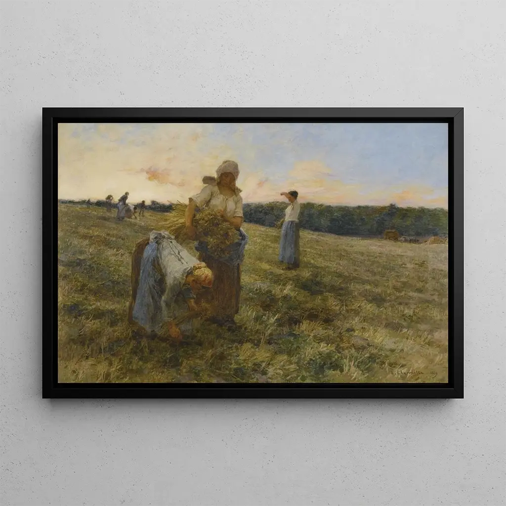Dans "Glaneuses le soir", Léon Augustin Lhermitte nous transporte au cœur d'une scène bucolique où des femmes, courbées sous le poids de leur labeur, ramassent les épis de blé laissés par la moisson. La palette de couleurs chaudes, dominée par des tons dorés et terreux, évoque la douceur du crépuscule. La technique de Lhermitte, mêlant réalisme et impressionnisme, confère une atmosphère paisible et contemplative à cette œuvre. Les détails minutieux des visages et des vêtements des glaneuses témoignent d'un profond respect pour la vie paysanne, tandis que la lumière douce du soir enveloppe la scène d'une aura presque magique.