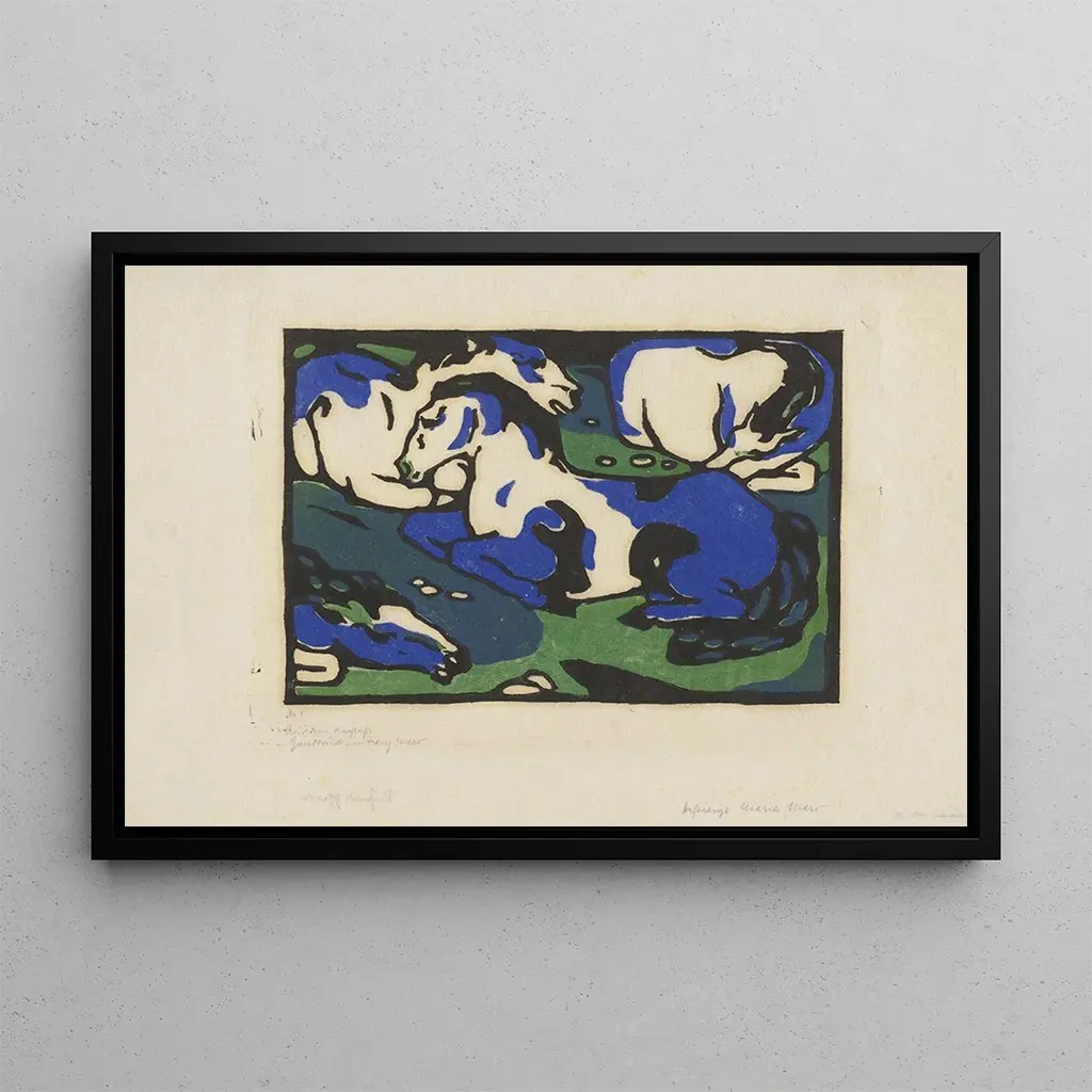 Chevaux au Repos : en hyllning till djurens skönhet "Chevaux au Repos", ett ikoniskt konsttryck av Franz Marc, fångar själva essensen av harmonin mellan djuret och naturen. Hästarna, avbildade i livfulla nyanser av blått, gult och rött, tycks blomstra i ett drömlikt landskap. Marc's teknik, kännetecknad av stiliserade former och djärva färger, skapar en atmosfär som är både dynamisk och lugn. Denna målning framkallar ett ögonblick av stillhet, där hästarna, symboler för styrka och frihet, vilar fridfullt och erbjuder betraktaren en lugnande och kontemplativ vision. Franz Marc : pionjär inom fauvism och expressionism Franz Marc, en framstående figur i början av 1900-talet, är en av grundarna av expressionistiska rörelsen i Tyskland. Påverkad av fauvism och de andliga filosofierna i sin tid, utvecklar han en unik stil som lyfter fram färg och form för att uttrycka djupa känslor. Hans passion för djur, som han ser som symboler för renhet, återspeglas i hans verk. "Chevaux au Repos" är ett vittnesmål om hans engagemang för att skildra naturen och djuren, samtidigt som det avslöjar hans önskan att transcendera verkligheten genom konst. En dekorativ tillgång med många fördelar Konsttrycket av "Chevaux au Repos" är ett perfekt val för dem som vill tillföra en konstnärlig touch till sitt hem. Oavsett om det är i ett vardagsrum, ett kontor eller ett sovrum, drar detta konsttryck till sig blickar och väcker beundran. Dess reproduktionskvalitet garanterar trohet mot de livfulla färgerna och de dynamiska formerna i originalverket, vilket berikar ditt boende. Med sitt estetiska tilltal och sin symboliska djup blir detta konsttryck en verklig samtalsstart, som förvandlar din inredning till en hyllning till djurens skönhet och konst.