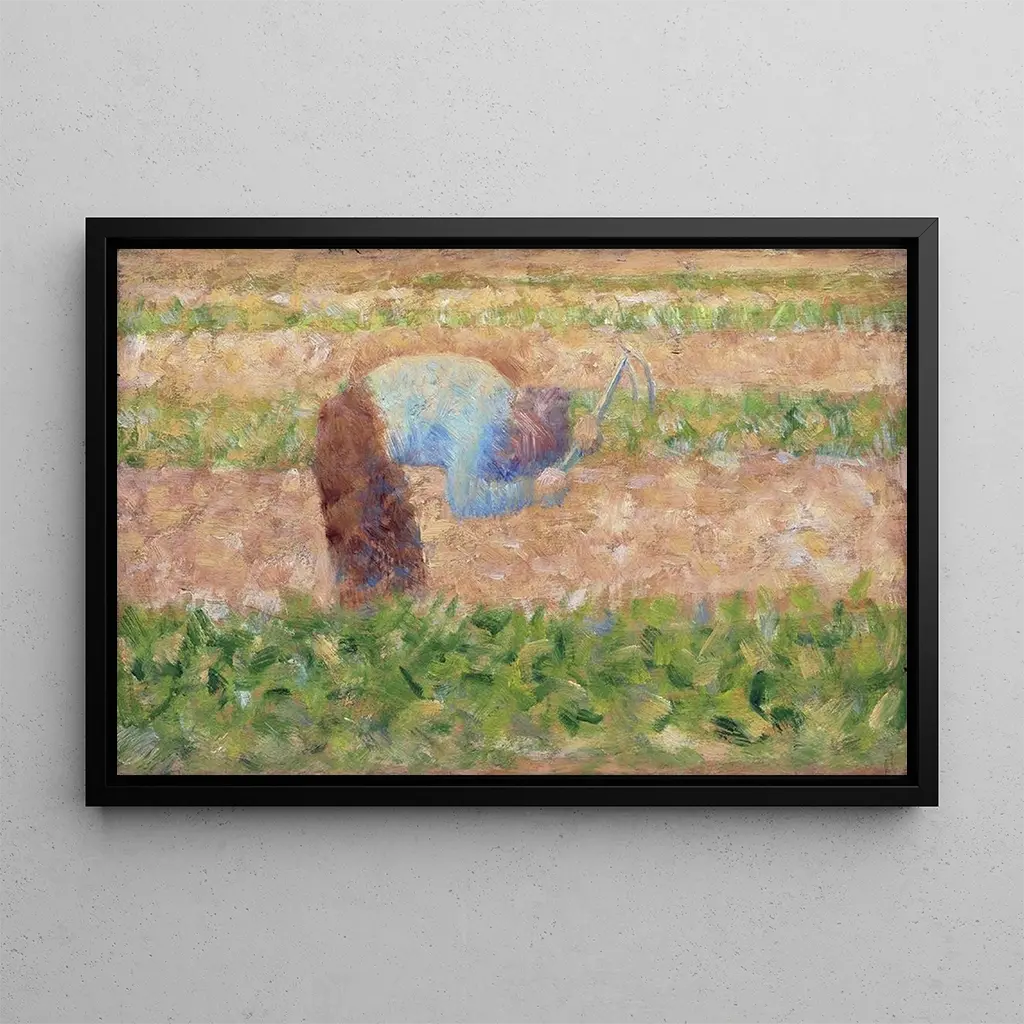 Homme avec une Houe : une œuvre emblématique de la vie rurale Dans cette reproduction d'Homme avec une Houe, Georges Seurat nous plonge dans l'univers paisible des travailleurs de la terre. La toile, réalisée avec la technique du pointillisme, se distingue par ses couleurs vibrantes et ses nuances délicates. Les formes se dessinent subtilement, créant une atmosphère à la fois sereine et contemplative. Le personnage central, armé de sa houe, semble incarner la force tranquille du paysan, tandis que le paysage environnant évoque une nature généreuse et accueillante. Seurat parvient à capturer l'essence même du labeur quotidien, transformant une scène ordinaire en un moment de poésie visuelle. Georges Seurat : pionnier du pointillisme et maître de la lumière Né en 1859, Georges Seurat est un artiste français qui a marqué l'histoire de l'art par son approche innovante. Il est le fondateur du mouvement pointilliste, qui repose sur l'application de petites touches de couleur juxtaposées pour créer des effets lumineux et vibrants. Influencé par les théories scientifiques de la couleur et les œuvres des impressionnistes, Seurat a su développer un style unique qui a ouvert la voie à de nouvelles explorations artistiques. Son travail, bien que relativement court en raison de sa mort prématurée à 31 ans, a eu un impact considérable sur le développement de l'art moderne, inspirant de nombreux artistes à travers les décennies. Une acquisition décorative aux multiples atouts La reproduction d'Homme avec une Houe constitue un choix idéal pour embellir votre intérieur, que ce soit dans un salon, un bureau ou une chambre. Sa qualité d'impression fidèle et son attrait esthétique en font une pièce maîtresse qui attire le regard et suscite la réflexion. En intégrant ce tableau dans votre décoration, vous apportez une touche d'élégance et de culture, tout en célébrant le travail et la nature. Cette toile est non seulement un élément décoratif, mais aussi une invitation à la contemplation et à l'appréciation de la beauté du quotidien.