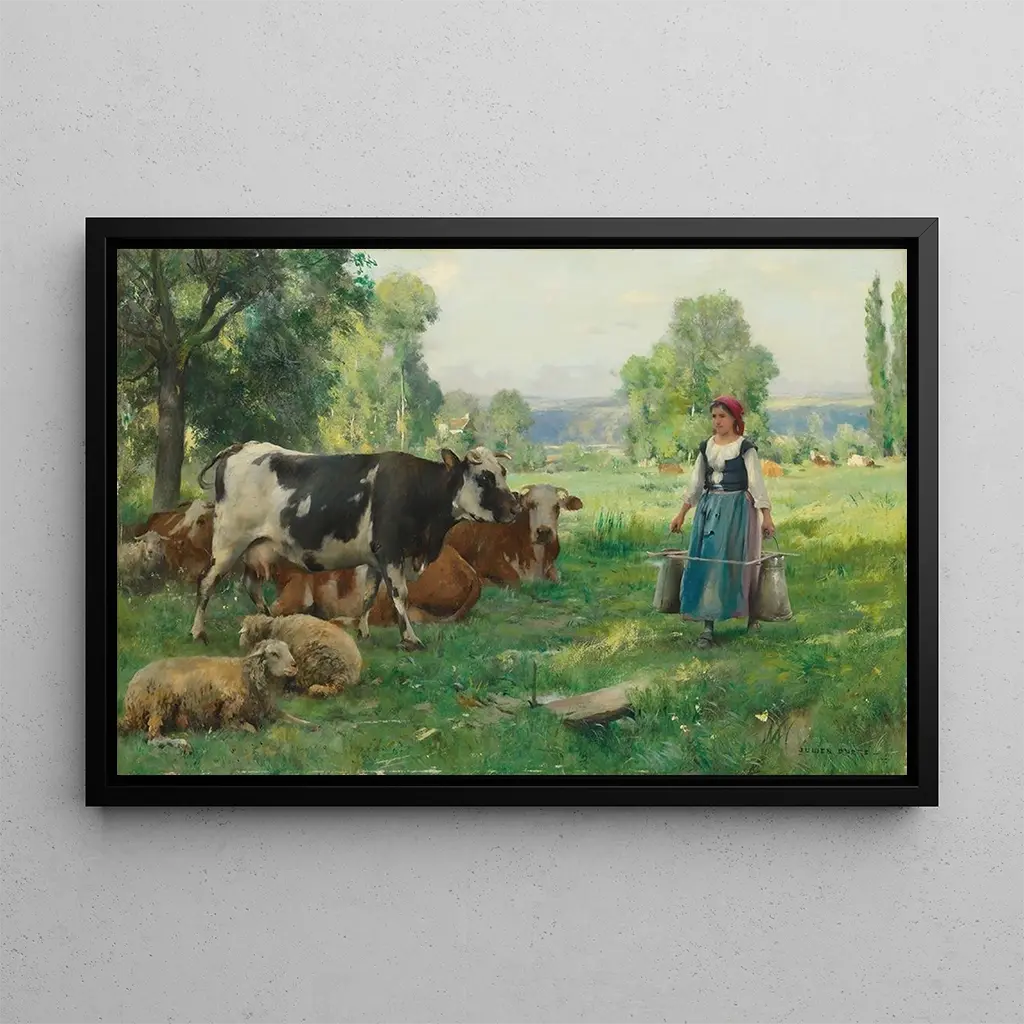 I ett betesmark: en hyllning till den idylliska friden I denna konsttryck av "I ett betesmark" förflyttar Julien Dupré oss till hjärtat av en pastoral scen fylld av lugn. De mjuka nyanserna av naturen, från strålande grönt till varmbrunt, harmoniserar för att skapa en lugnande atmosfär. Duprés impressionistiska teknik visar sig genom flytande penseldrag, som fångar ljuset som dansar över ytorna. Djur, lugnt spridda i landskapet, tillför en levande touch till detta konsttryck, inbjudande betraktaren att fördjupa sig i ett ögonblick av stillhet och eftertanke. Julien Dupré: en mästare av landskapsmåleri Julien Dupré, verksam i slutet av 1800-talet, är erkänd för sina skildringar av det franska landslivet. Påverkad av impressionismen, lyckades han fånga skönheten i landskapen och enkelheten i det lantliga livet. Hans karriär, präglad av noggrannhet i detaljer och ljus, har gett honom en plats bland samtida konstnärer. Dupré valde ofta att måla scener från landsbygden, där den harmoniska relationen mellan människa och natur framhävs, vilket har gett honom ett bestående erkännande inom konstvärlden. En dekorativ konsttryck med många fördelar Konsttrycket av "I ett betesmark" är ett perfekt dekorativt föremål för att tillföra natur till ditt hem. Oavsett om det är i ett vardagsrum, ett kontor eller ett sovrum, framkallar detta konsttryck frid och skönhet i landskapet. Dess konsttrycks kvalitet garanterar trohet mot färger och detaljer i originalverket, samtidigt som det erbjuder en estetisk attraktion. Genom att välja detta konsttryck, väljer du en dekoration som inspirerar till fred och eftertanke, och berikar ditt boende.