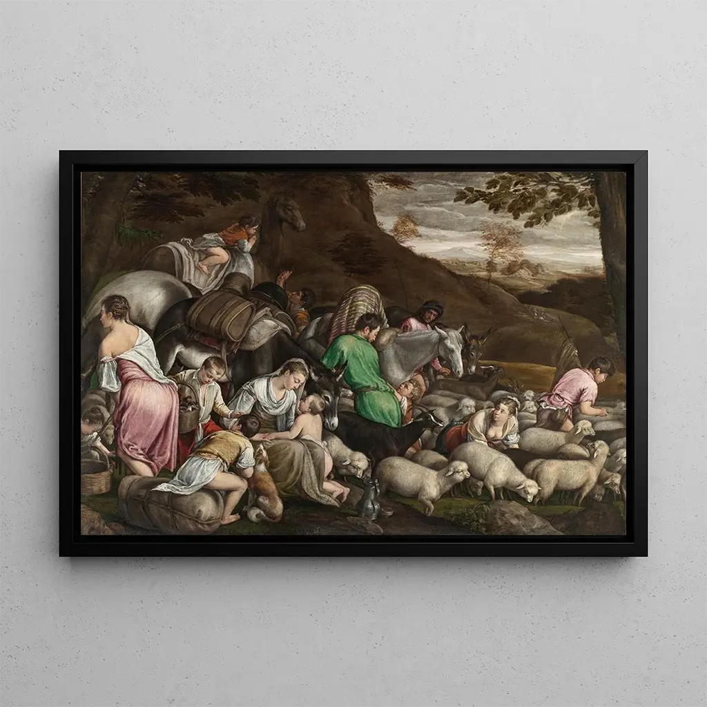Jacopo Bassano, peintre italien du XVIe siècle, est reconnu pour son style unique qui allie influences vénitiennes et éléments narratifs. Sa carrière est marquée par une exploration des thèmes religieux et mythologiques, souvent enrichis de détails réalistes. Bassano a su s'imposer dans le milieu artistique de la Renaissance, et son œuvre "Le Voyage de Jacob" est emblématique de son talent à capturer des moments de tension et de beauté. Son approche innovante et sa maîtrise des couleurs font de lui une figure incontournable de l'histoire de l'art, et cette konsttryck témoigne de son héritage artistique.