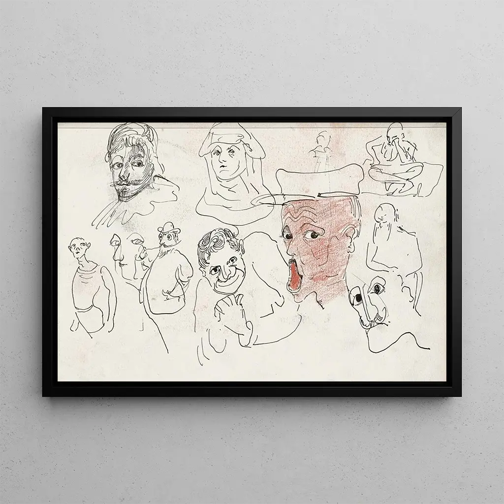 Les Têtes caricaturales de Carel Adolph Lion Cachet sont une célébration de l'expression humaine à travers des formes exagérées et des couleurs vives. Chaque visage, avec ses traits accentués, évoque une personnalité unique, presque vivante. La technique de l'artiste, qui mêle aquarelle et encre, crée une atmosphère ludique et dynamique, invitant le spectateur à explorer les émotions et les histoires derrière chaque caricature. La composition, souvent asymétrique, renforce l'idée de mouvement et de vivacité, transformant chaque tableau en une scène vibrante de vie.