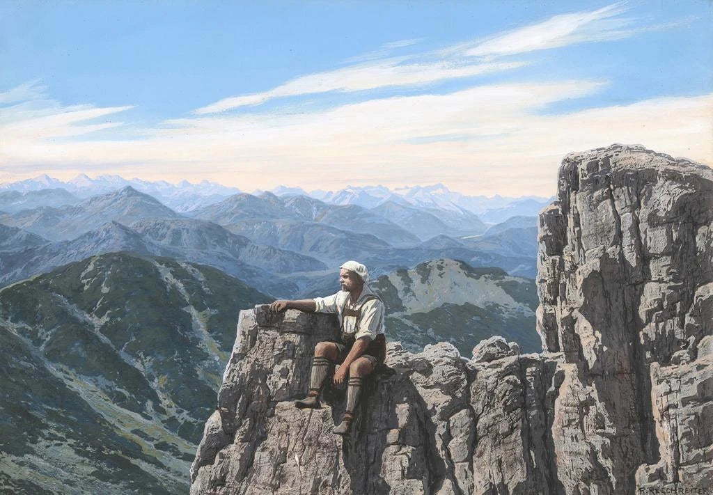 Konsttrycket "L'artisten på Plankenstein" av Rudolf Reschreiter fördjupar oss i en värld där naturen och konsten möts med en gripande intensitet. Kompositionen framhäver en kontemplativ konstnär, förlorad i sina tankar, medan det bergiga landskapet, badat i nyanser av smaragdgrönt och azurblått, framkallar en nästan mystisk frid. Penseldragen, både delikata och djärva, skapar en livfull atmosfär, där varje element verkar berätta en historia. Ljuset spelar en avgörande roll, subtilt belysande detaljerna i målningen och förstärker den känsla som avges. Denna konsttryck inbjuder till en djup reflektion över förhållandet mellan konstnären och hans omgivning.